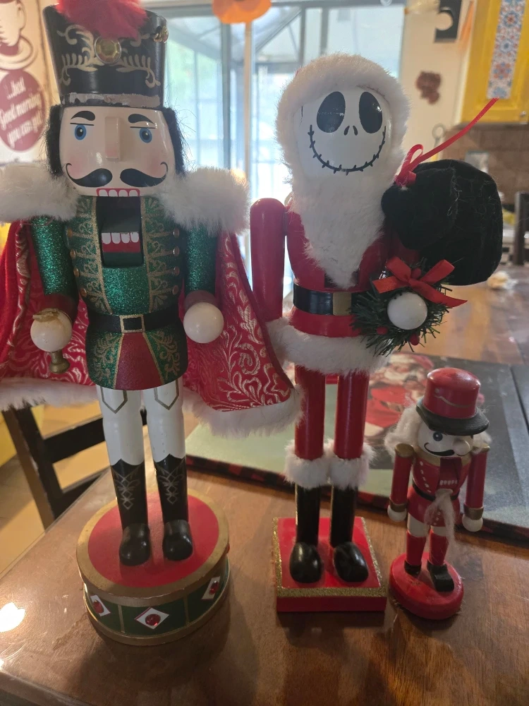 Selling a set of charming nutcracker figures, perfect for adding a festive touch to your Christmas decor! The set includes a traditional nutcracker figure, a Santa Jack Skellington nutcracker, and a smaller red nutcracker figure. They're in great condition and ready to bring some holiday cheer to your home.