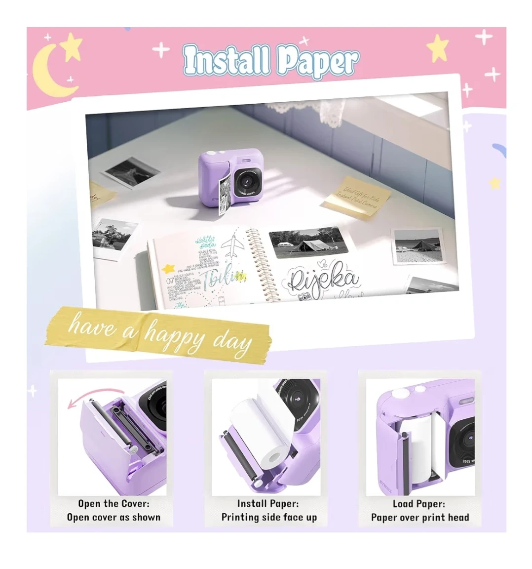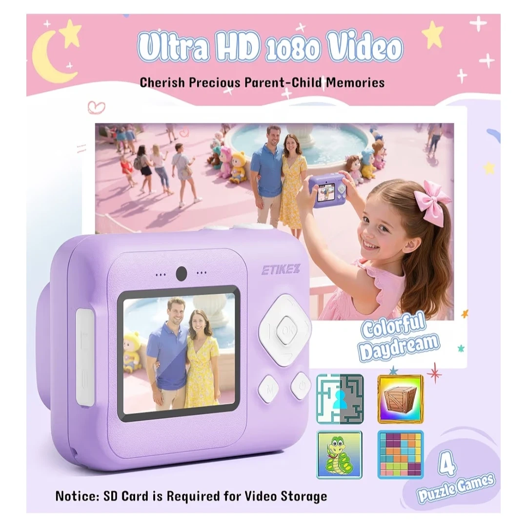 Kids Camera,1080P Instant Print Camera for Kids, Christmas Birthday Gifts Digital Camera with 32GB SD Card & 3 Rolls Printing Paper. This kids camera instantly prints black-and-white photos in just 1 second using thermal technology, while saving full-color versions to the included 32GB SD card. instant print camera also records 1080P HD videos and includes a 2.4" screen, 6x zoom, flash, games, filters frame, mp3. Kids can experiment with 5 filters and 19 playful frames, making every shot unique. With a front-facing camera, kids can capture and print their own adventures. Long press camera button can switch for front camera. New in box