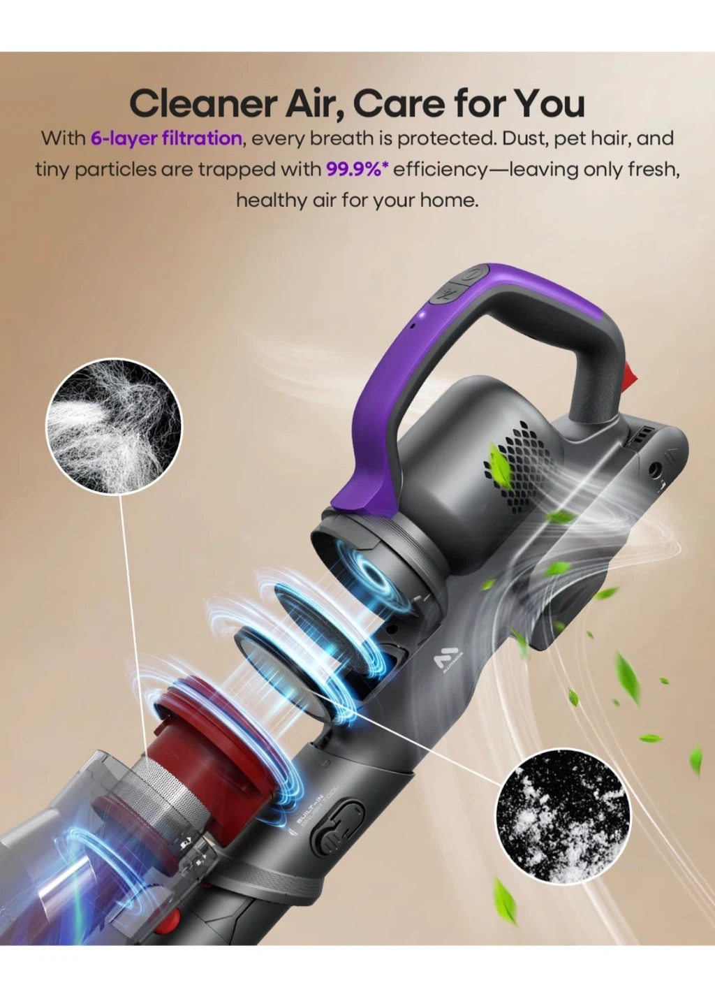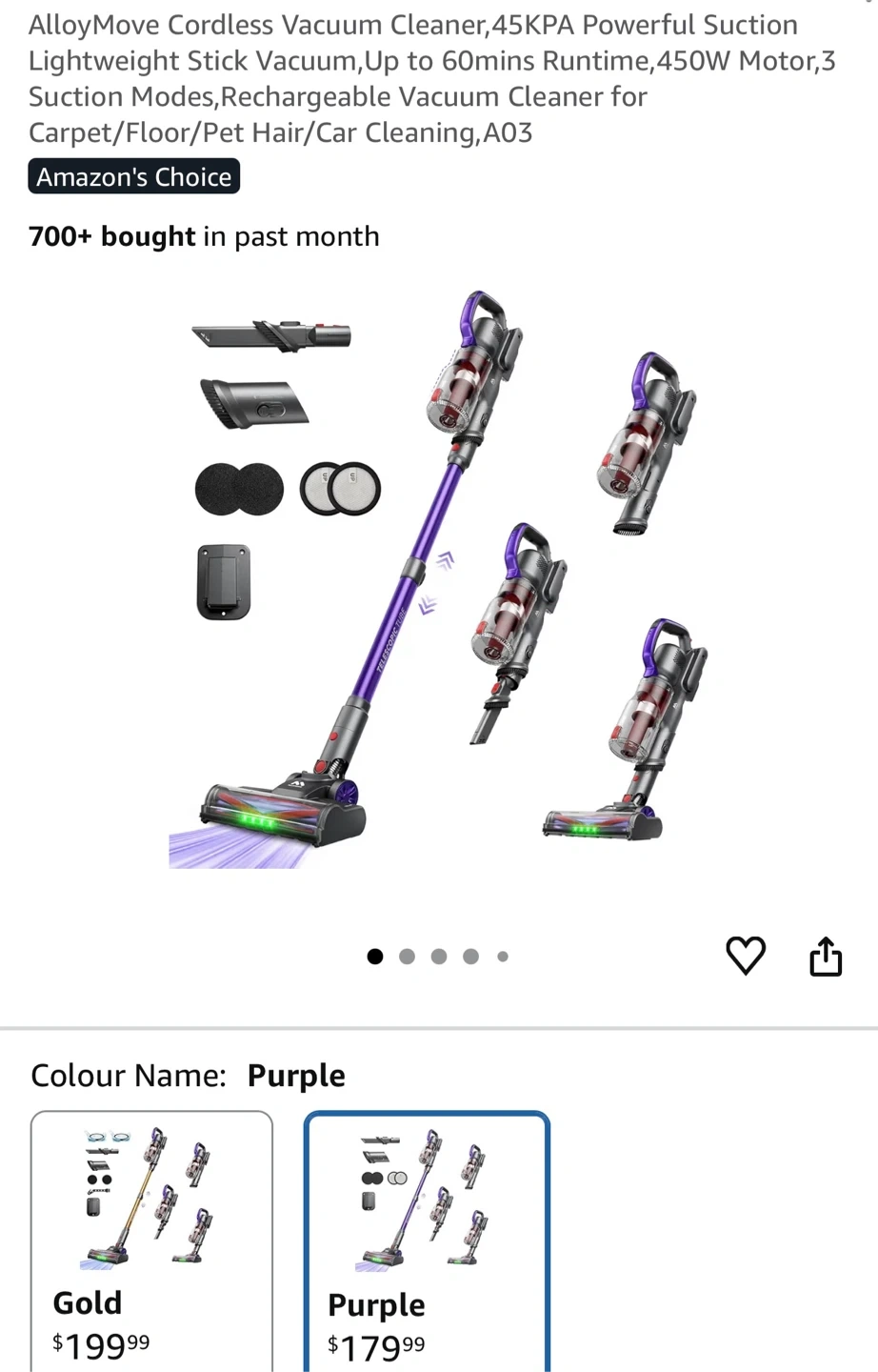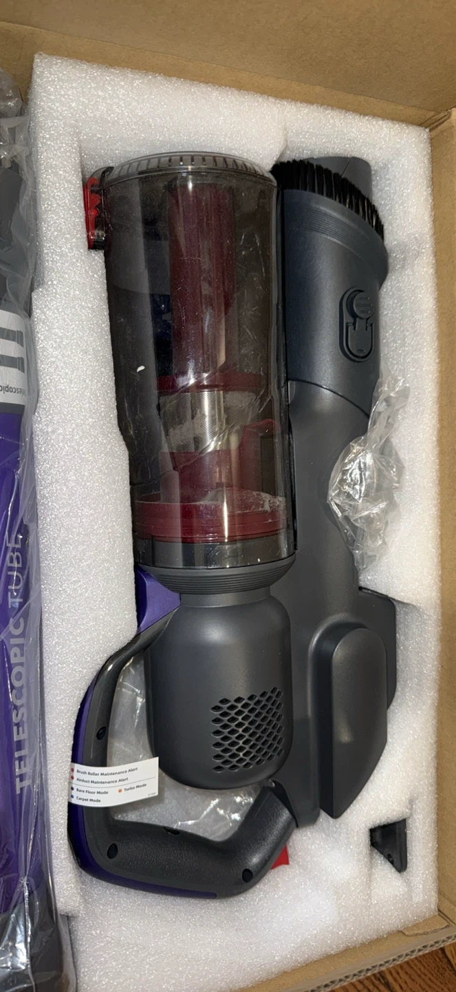 Selling an AlloyMove cordless vacuum cleaner in purple! It's a lightweight stick vacuum with powerful suction at 45KPa. It runs for up to 60 minutes and has a 450W motor. It features 3 suction modes and is rechargeable, perfect for carpet, floors, pet hair, and car cleaning. It also features 6-layer filtration, ensuring cleaner air for you and your family