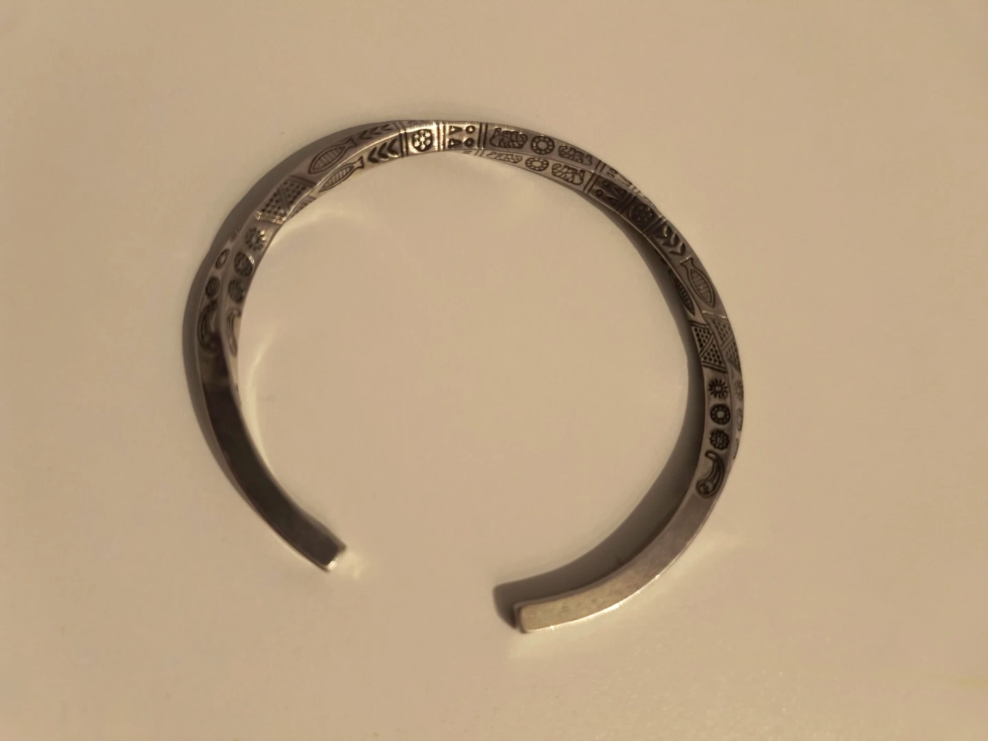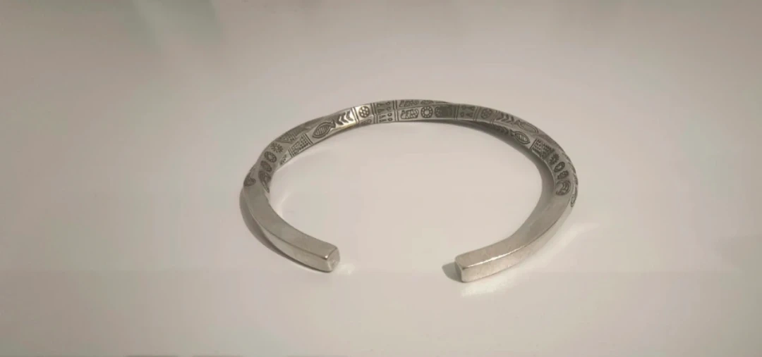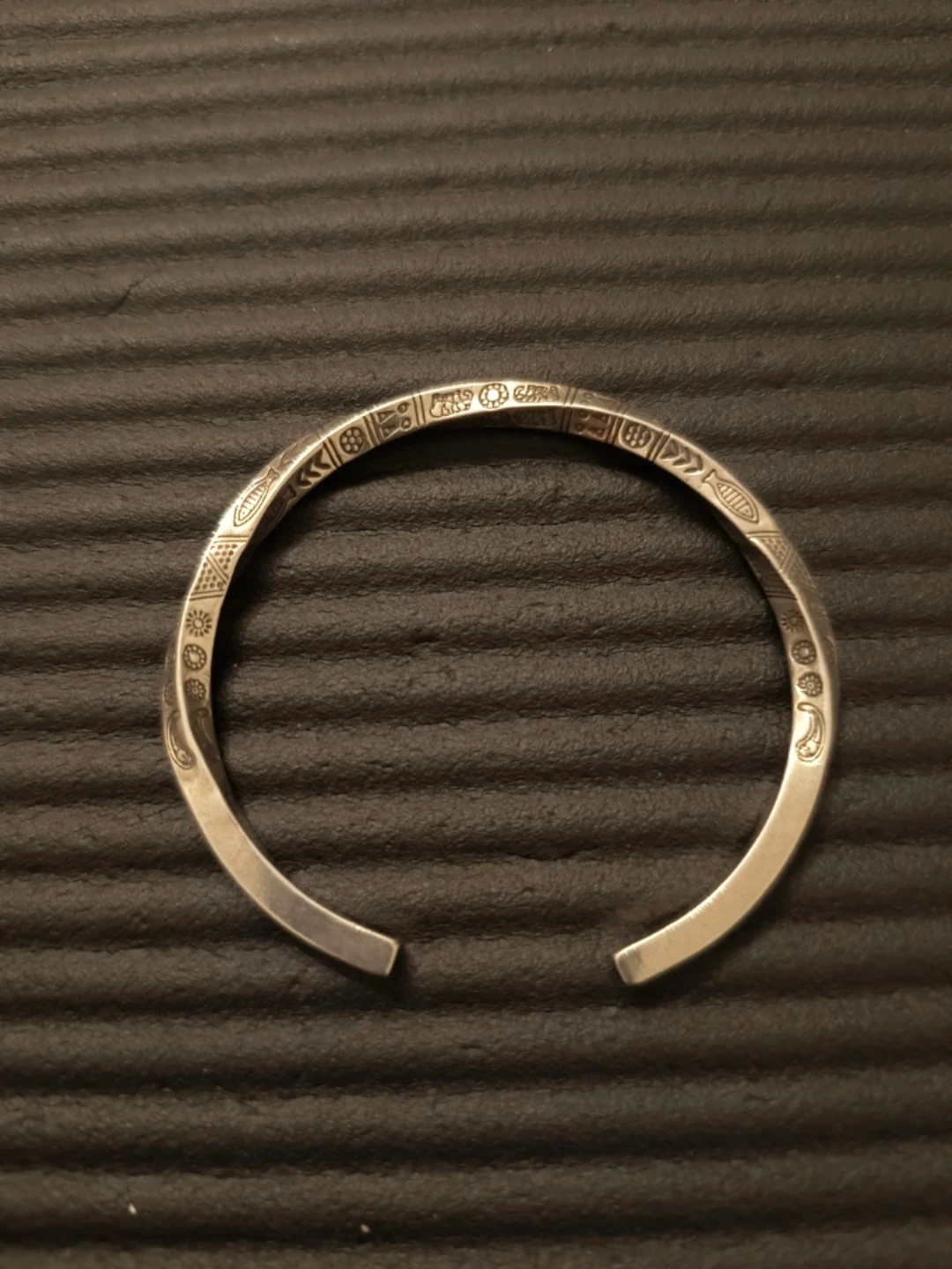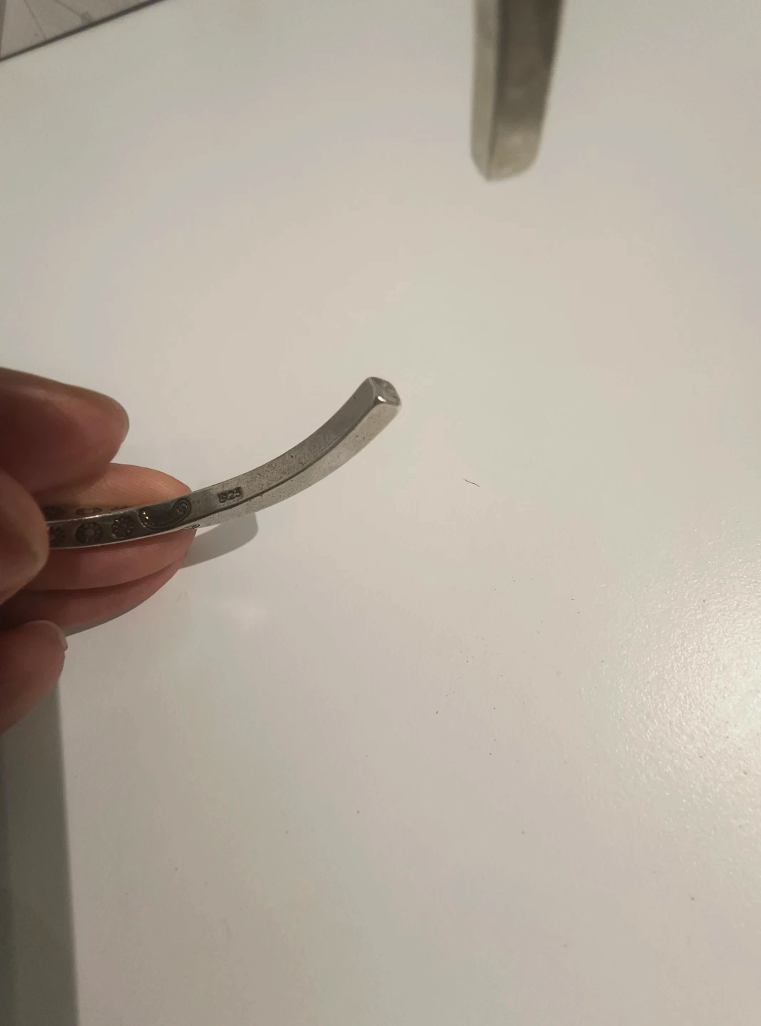 Selling a unique silver bangle bracelet. It has a distinctive design etched around the band and is marked with '925' indicating its silver purity.