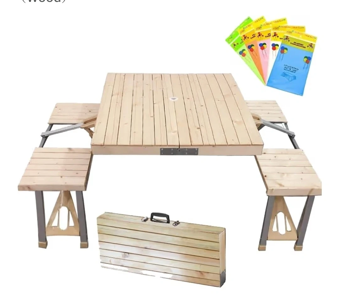 This portable folding picnic table is perfect for outdoor adventures! It features an attached seating arrangement that folds neatly into a suitcase for easy transport and storage. The table is made of wood and metal, and the dimensions are 33.5 x 28.3 x 26 inches when open.