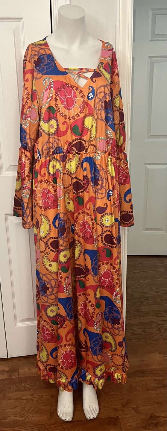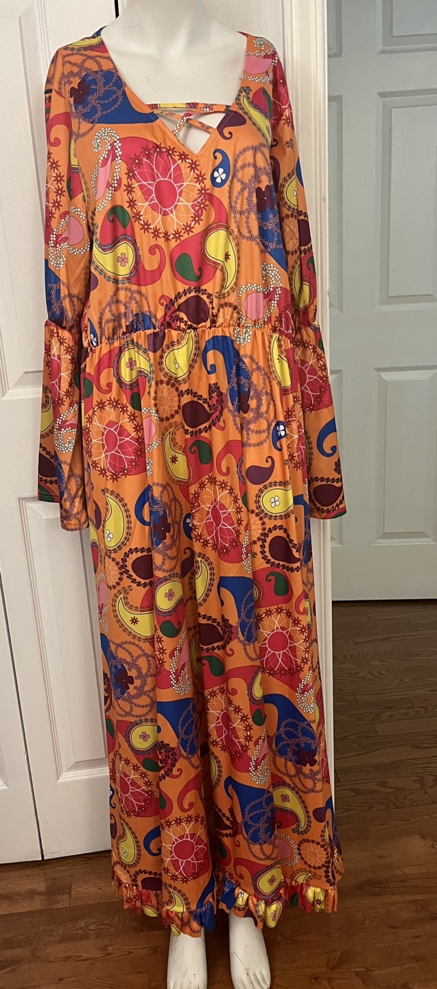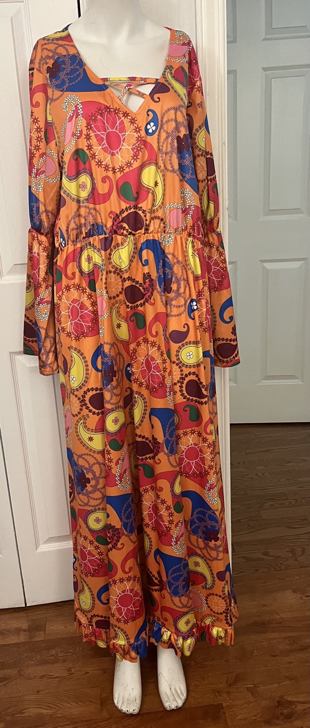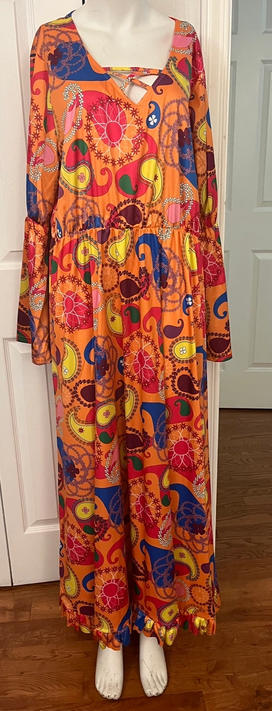 Eye-catching 70s-style maxi dress featuring a vibrant orange paisley pattern and long bell sleeves. Made from 100% polyester, it offers a comfortable fit with a flattering flowy design. Perfect for retro parties, themed events, or anyone who loves bold vintage fashion!