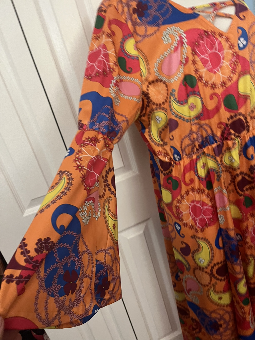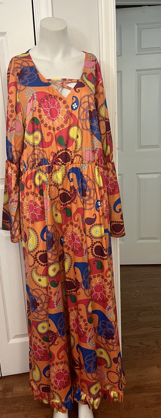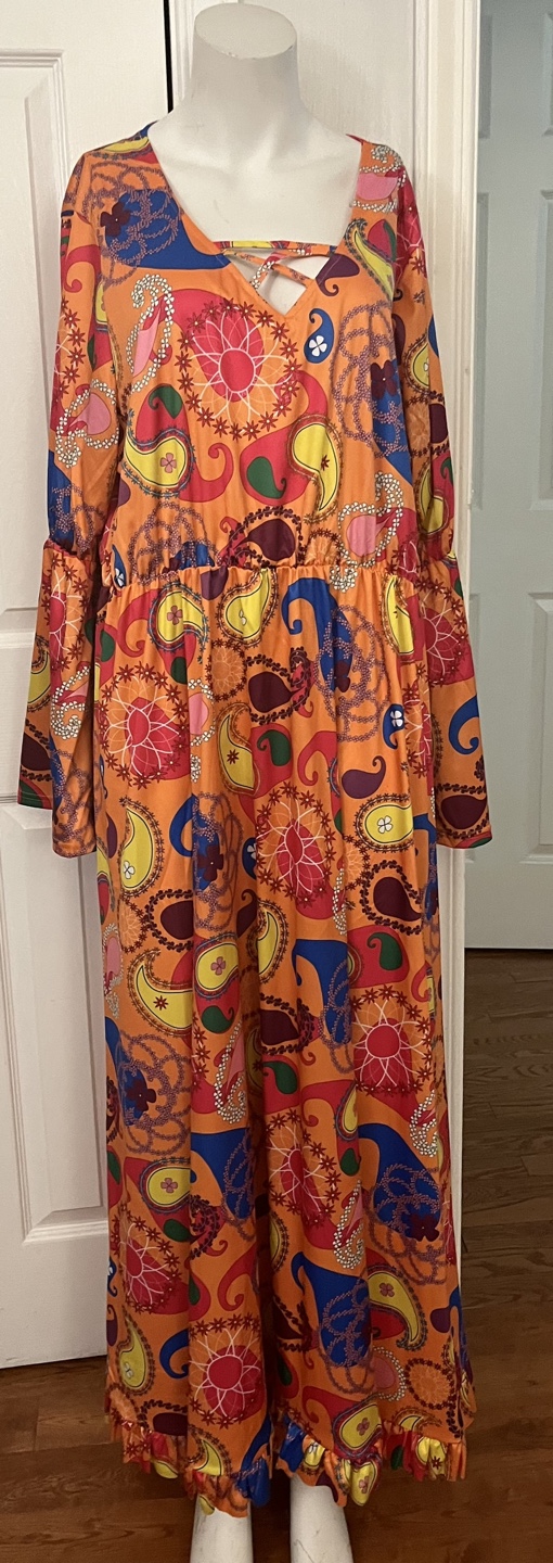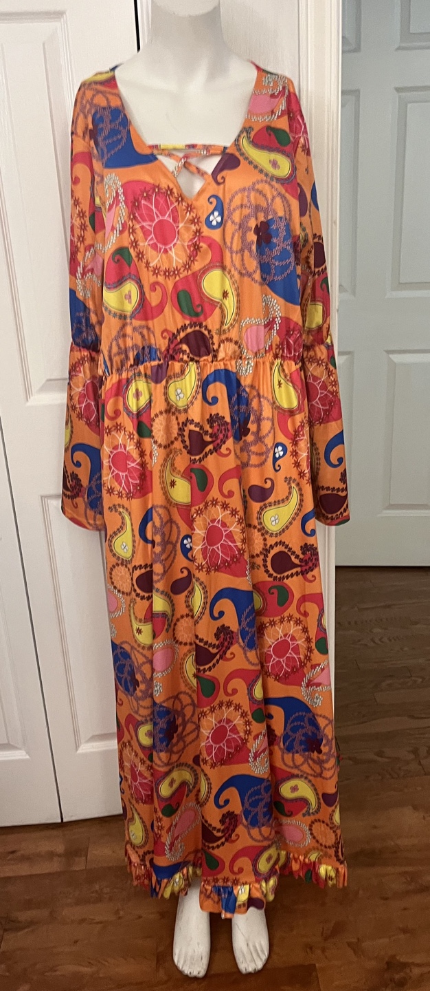 Eye-catching 70s-style maxi dress featuring a vibrant orange paisley pattern and long bell sleeves. Made from 100% polyester, it offers a comfortable fit with a flattering flowy design. Perfect for retro parties, themed events, or anyone who loves bold vintage fashion!