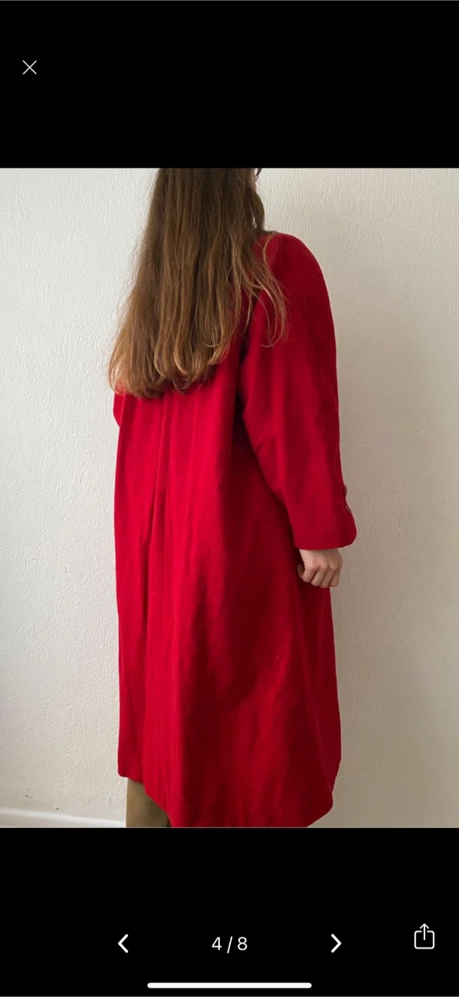 Here's a stylish red coat that's perfect for adding a pop of colour to your wardrobe! It features a double-breasted design and a cozy wool blend material. The coat also has black accents on the pockets for a touch of contrast. It's in great condition and ready for a new home!