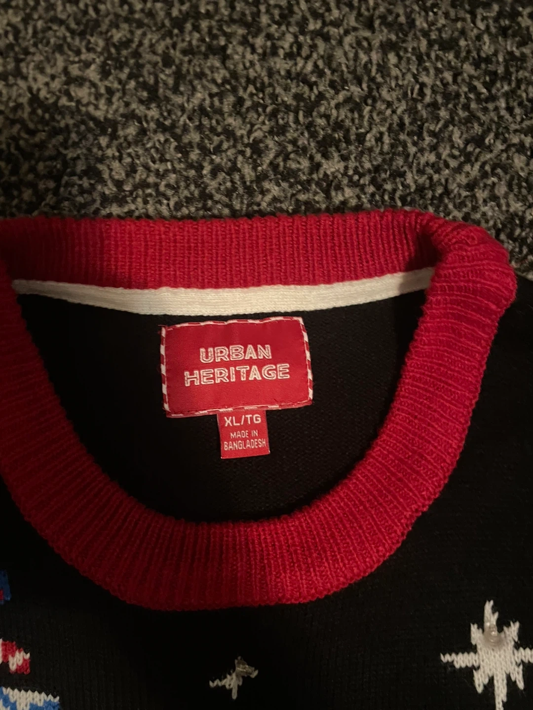 68Urban Heritage Christmas sweater in size XL/TG. It's black with a fun and festive design featuring Santa, dogs, and houses. The sweater also has lights to add some extra holiday cheer! Originally bought for $40. Sweater is brand new still in its bag and comes with batteries for the lights. The switch for the lights is on the inside of the sweater on the left side, you should be able to feel a small rectangular box. Selling it for 25 dollars!