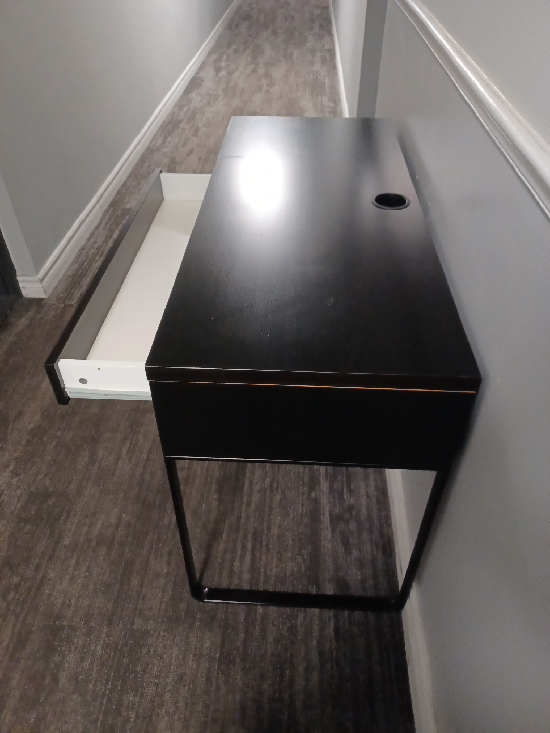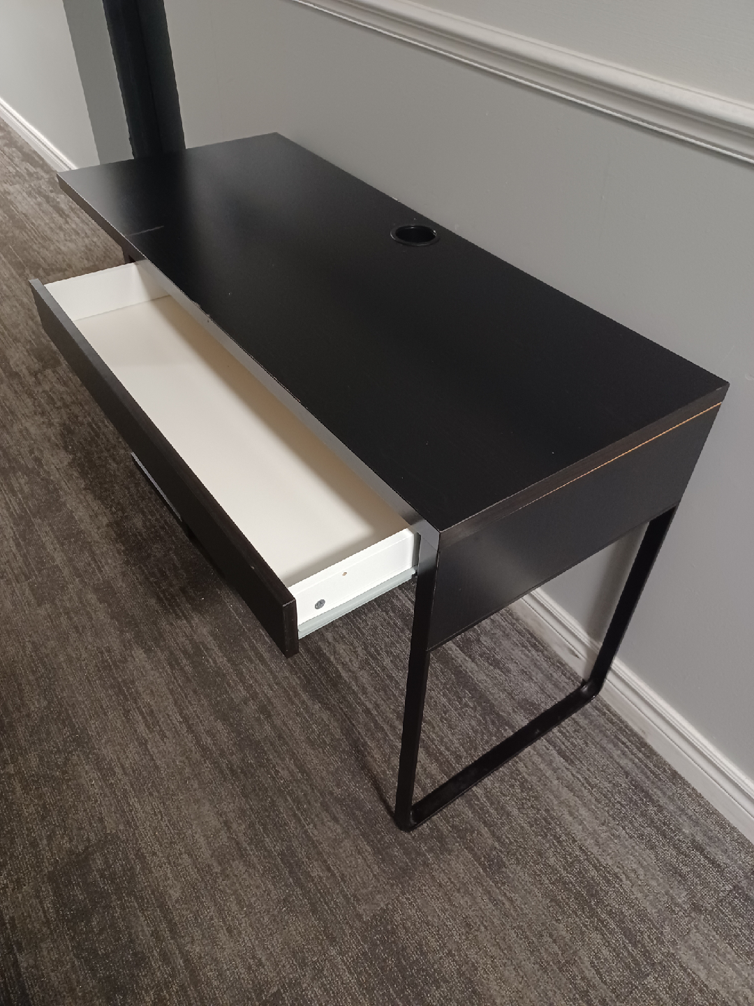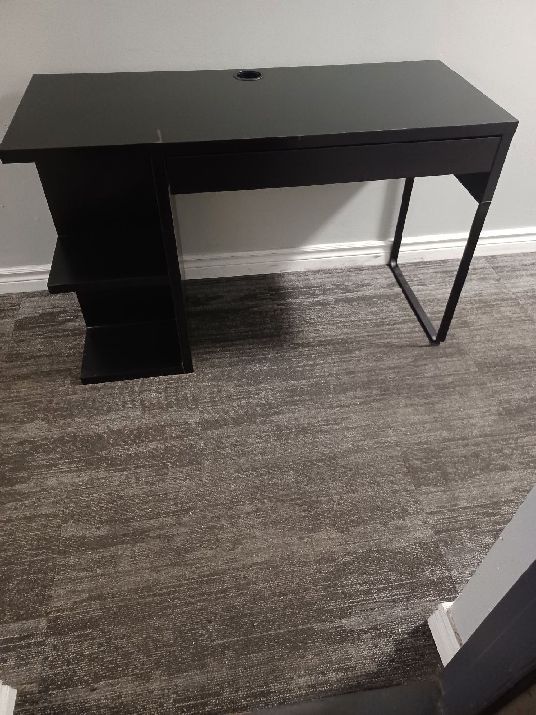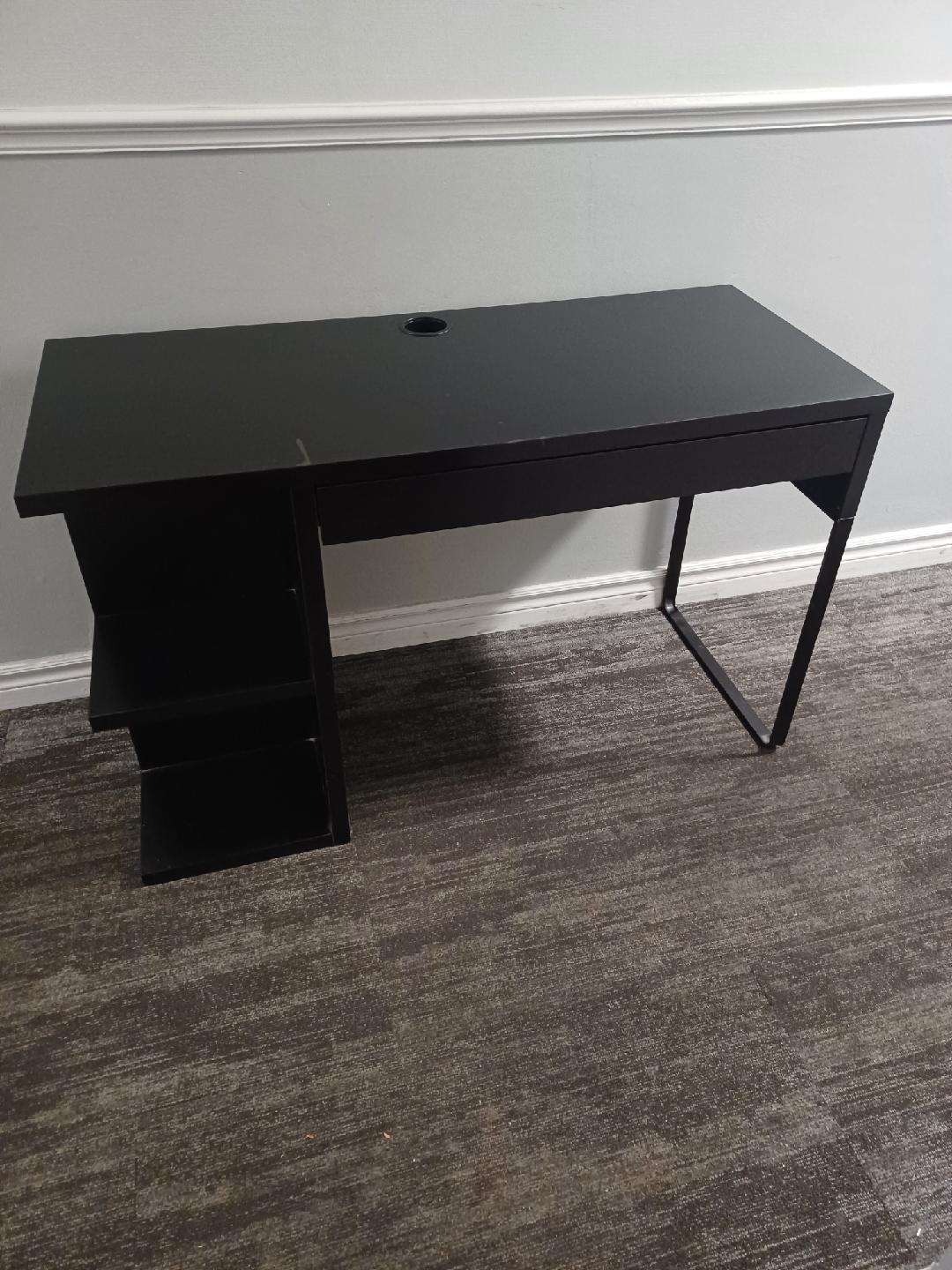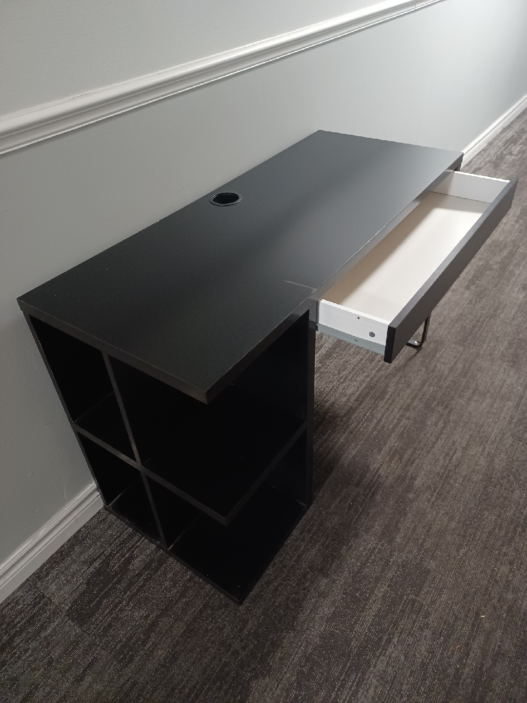 Selling a sleek black desk that's perfect for a home office or study space! It features a handy drawer and some shelves for extra storage. It's in great condition and ready for a new home!