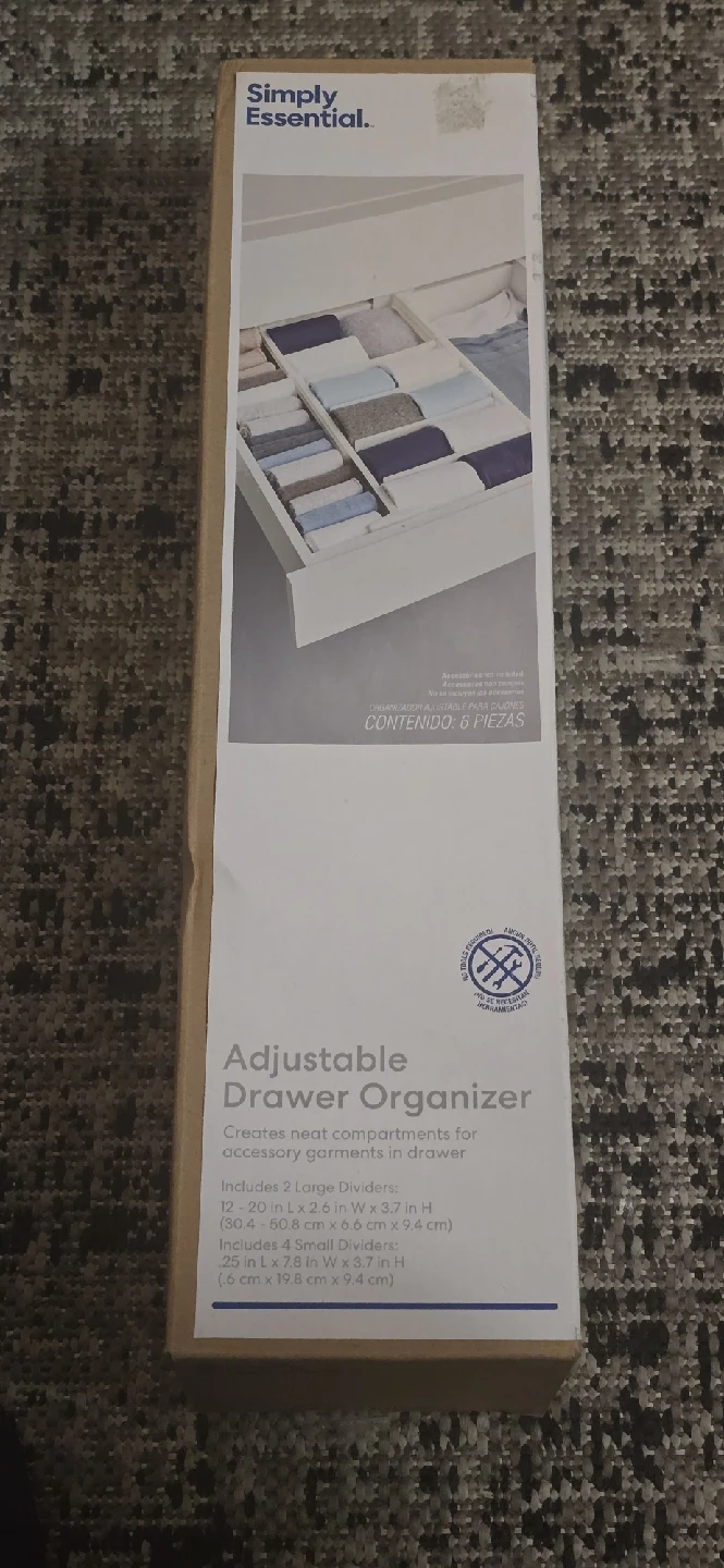 I' m selling a brand new Simply Essential Adjustable Drawer Organizer! It comes in its original box and includes 2 large dividers (12 x 20 in / 30.4 x 50.8 cm) and 4 small dividers (2.5 x 7.8 in / 6 cm x 19.8 cm). These create neat compartments for accessory garments in your drawer!