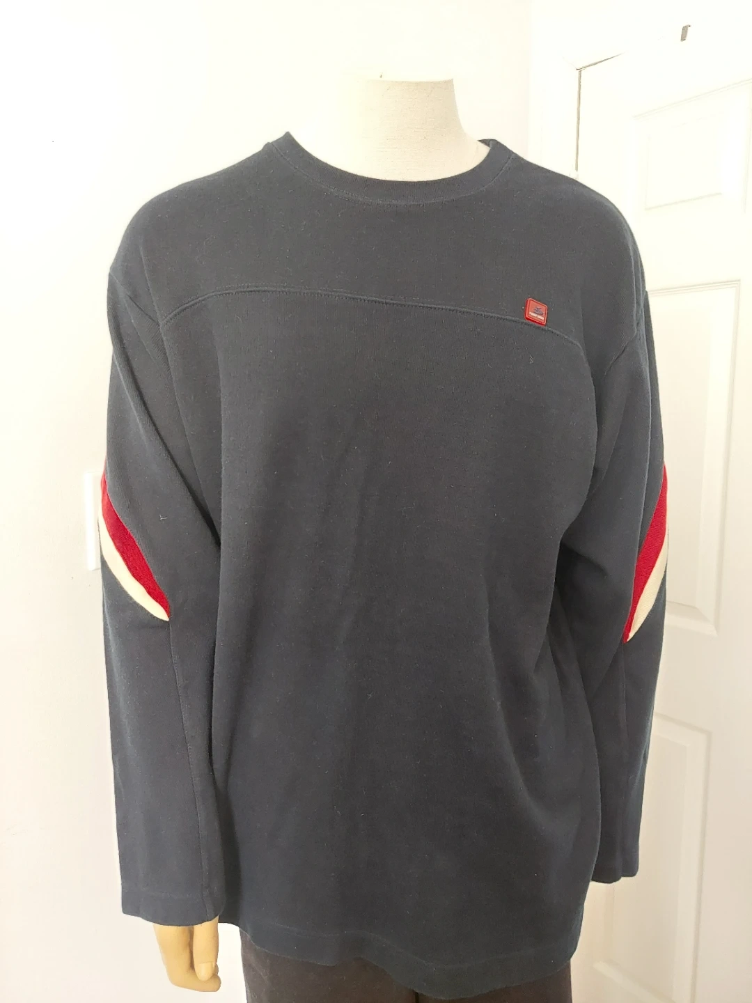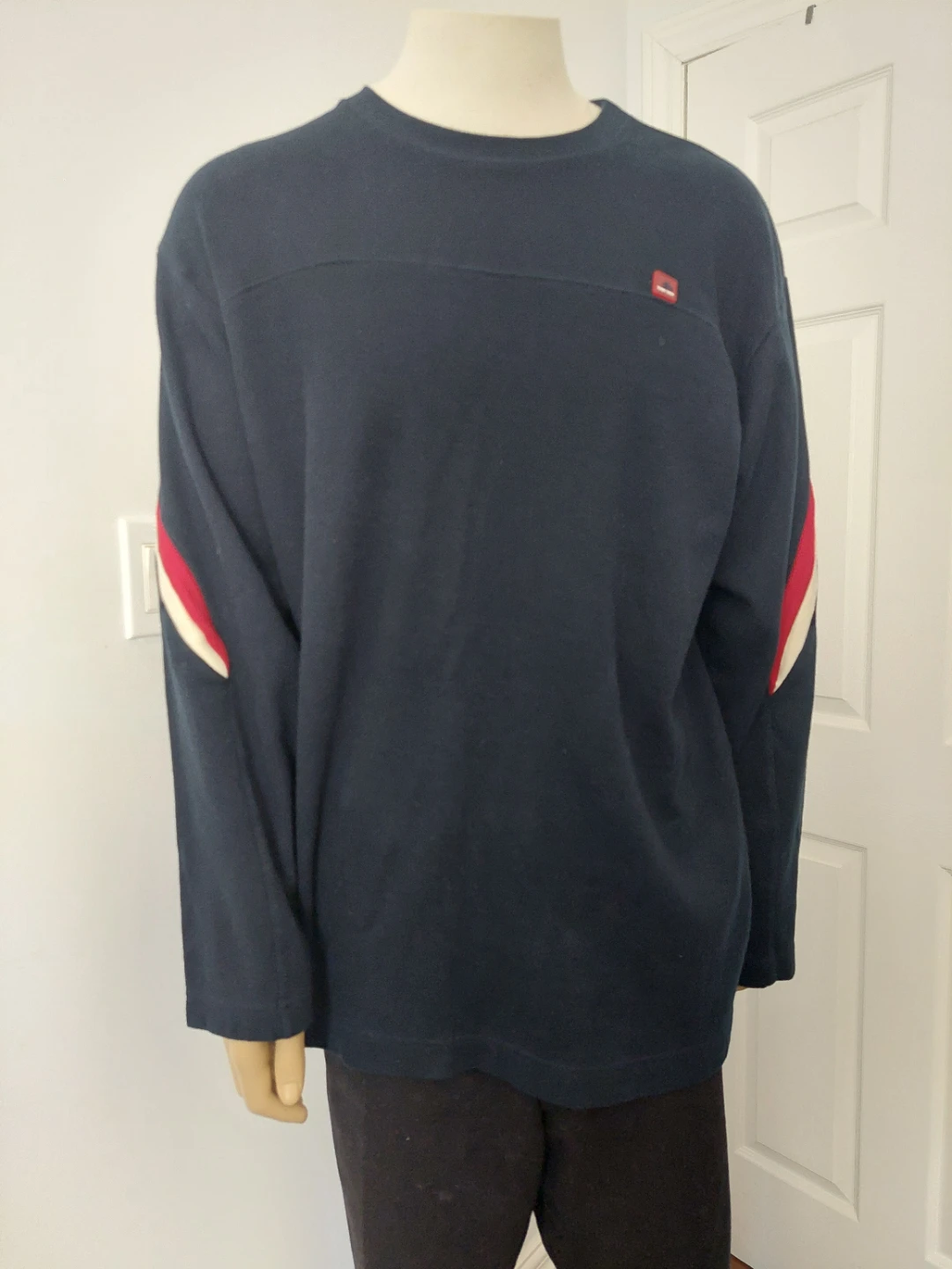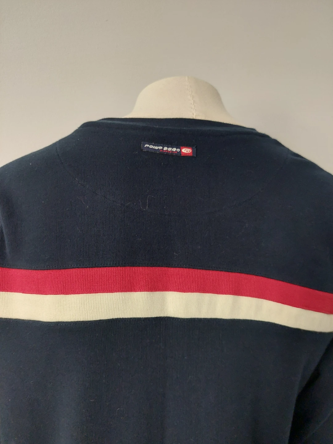 Here's a Point Zero long sleeve shirt in navy! It has a stripe design in red and white on the sleeves and across the back. It's in great condition.