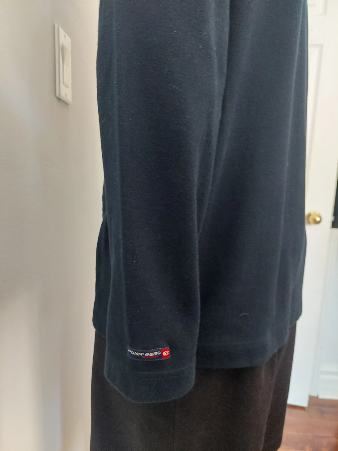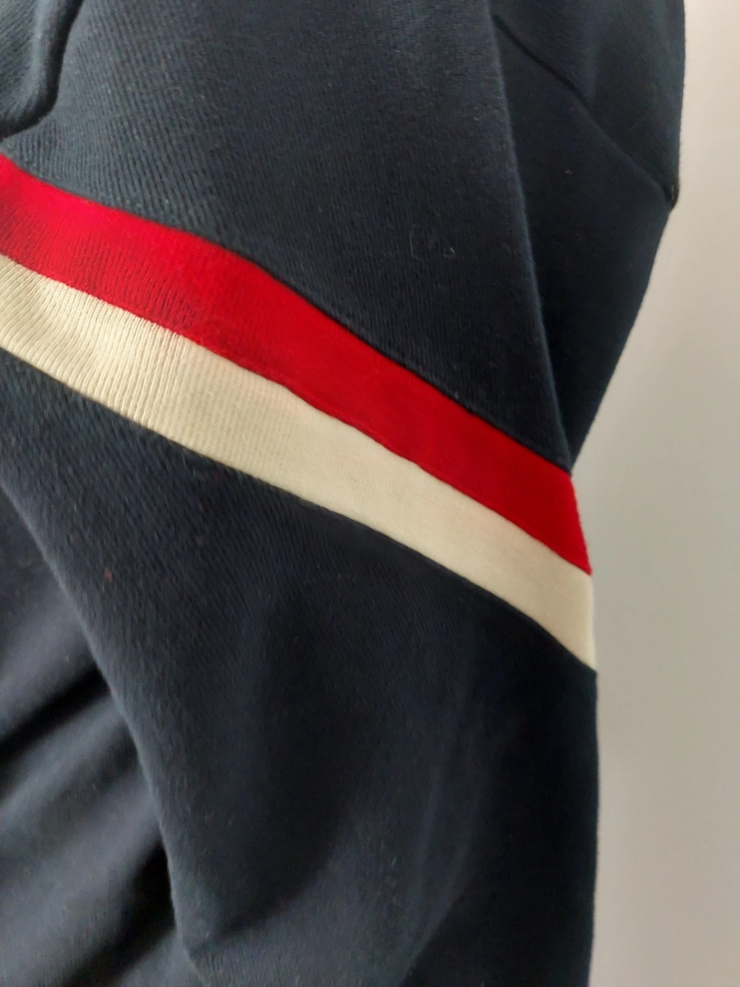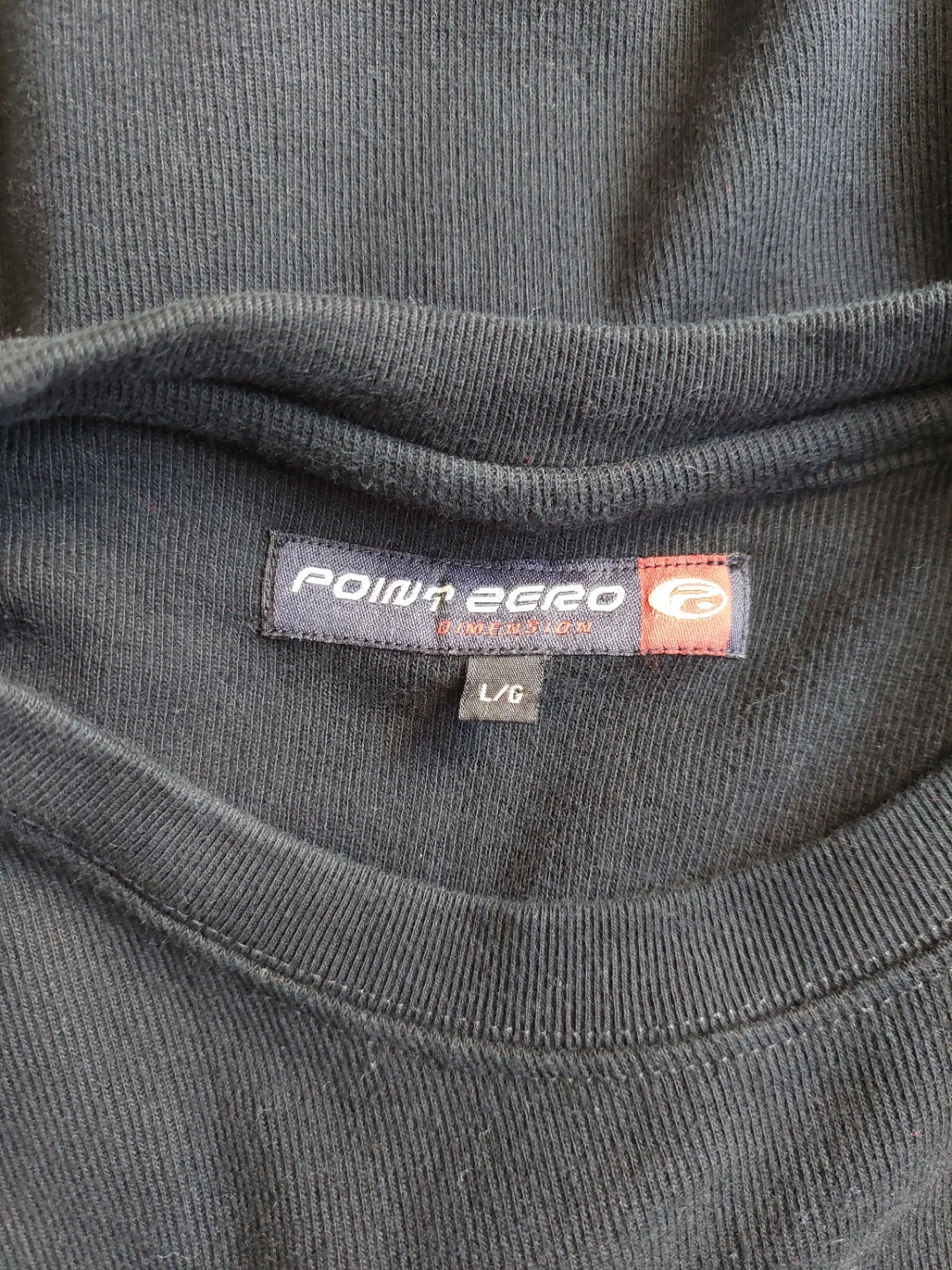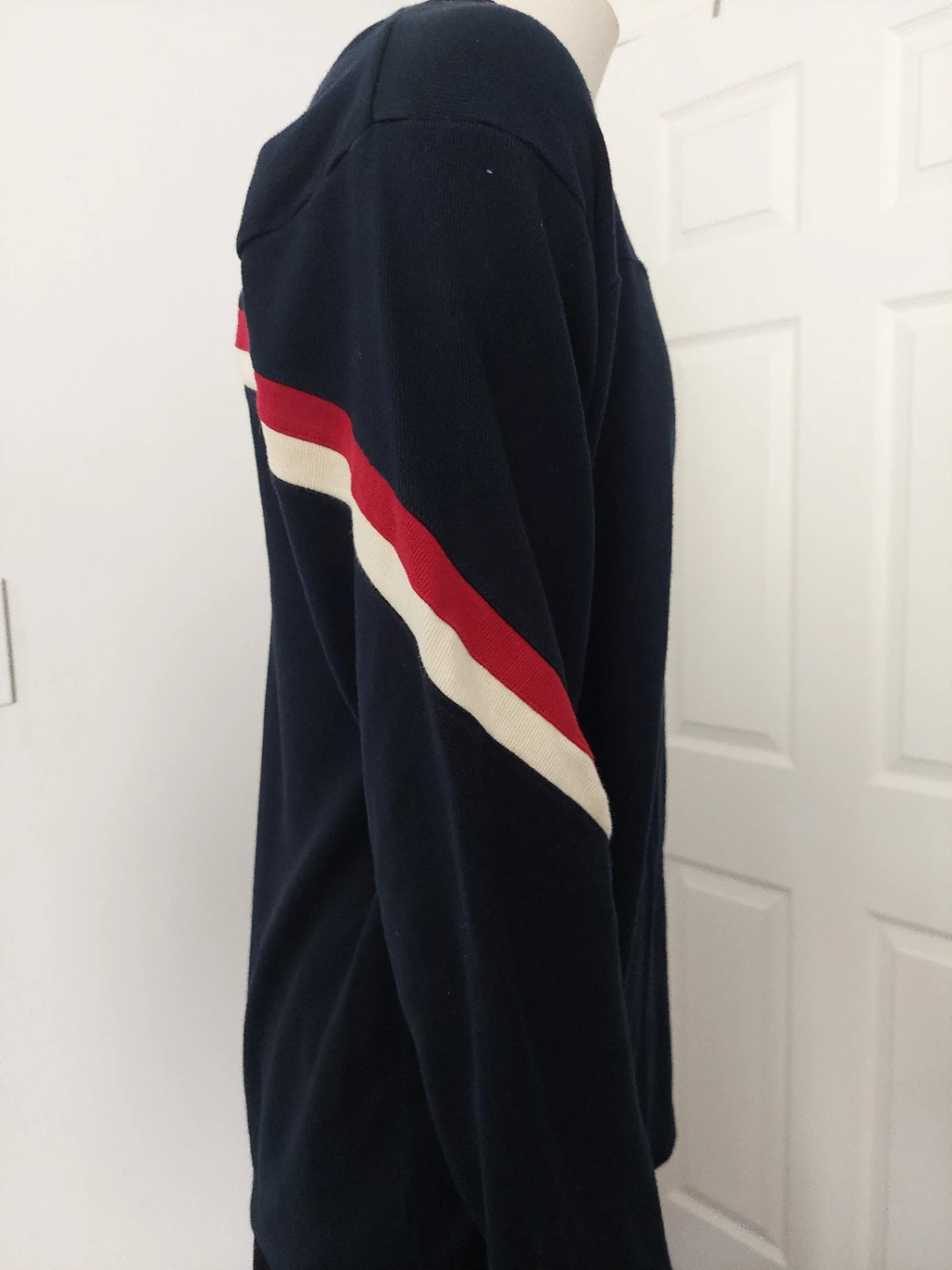 Here's a Point Zero long sleeve shirt in navy! It has a stripe design in red and white on the sleeves and across the back. It's in great condition.