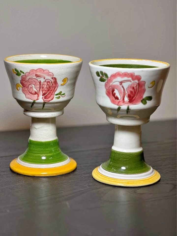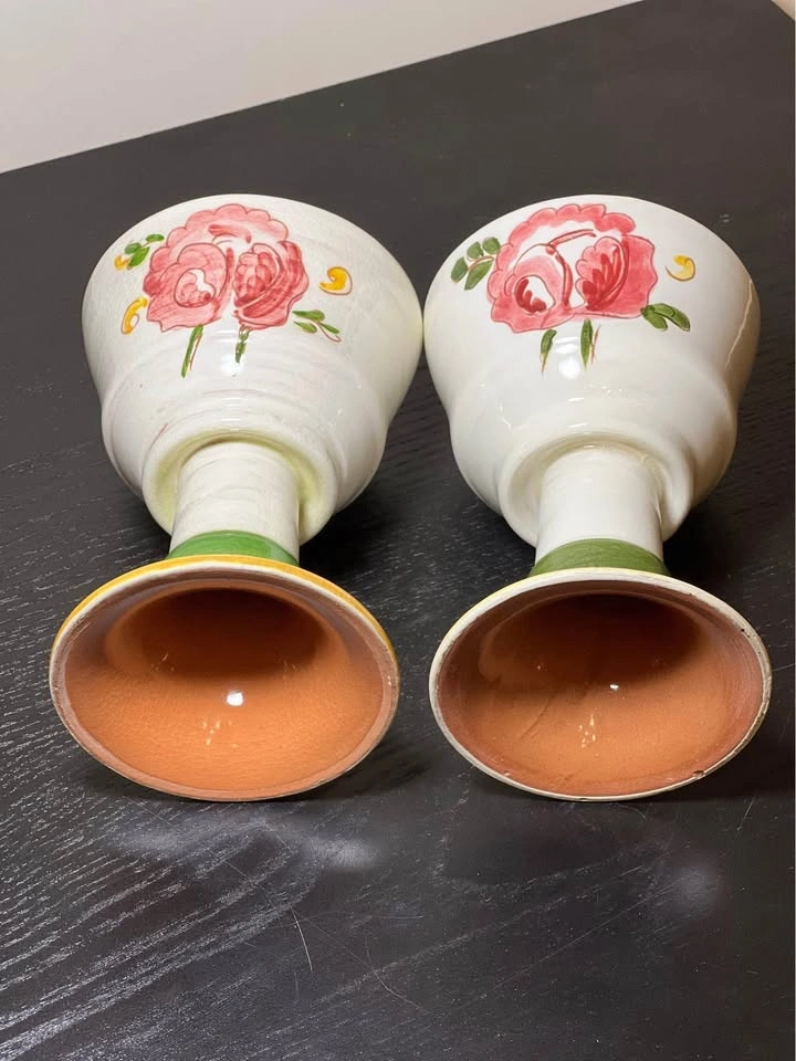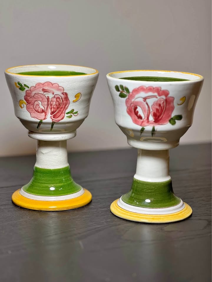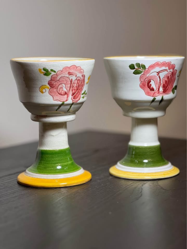 These are vintage Stangl Pottery goblets in the "Wild Rose" pattern. The Wild Rose pattern was designed by Kay Hackett and was produced by Stangl Pottery from 1955 to 1967. Stangl Pottery was known for its hand-painted designs, and each piece in the Wild Rose pattern features incised lines and raised details. The company was originally founded as Fulper Pottery in New Jersey and was later renamed Stangl Pottery. Vintage Stangl pottery is often used for display due to its age and hand-painted glazes, though it was originally made for everyday use. Sold as is. See photos for imperfections.