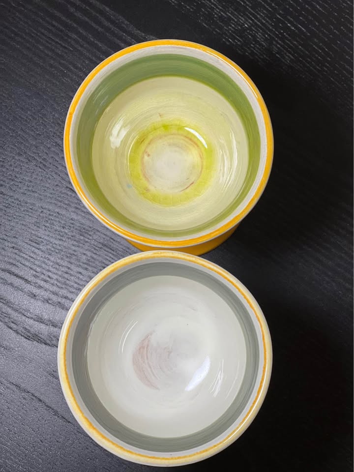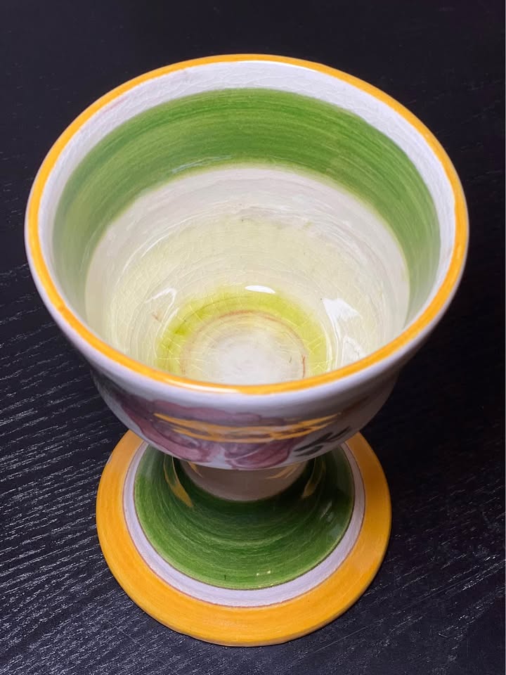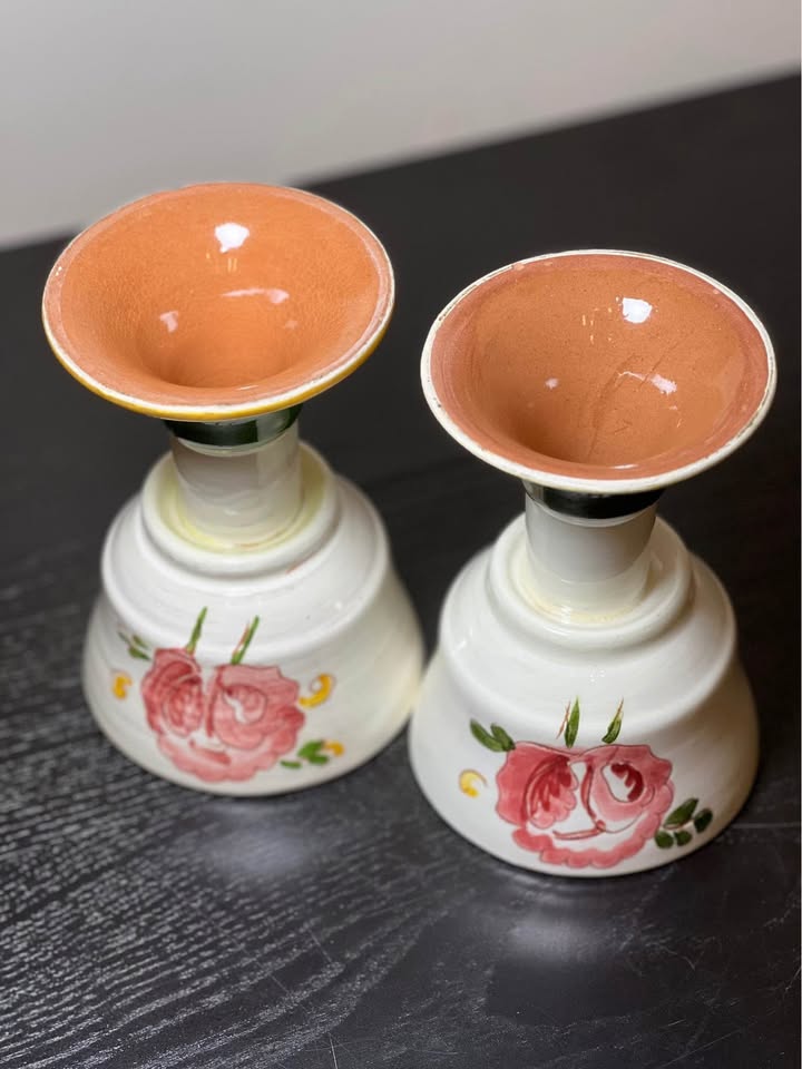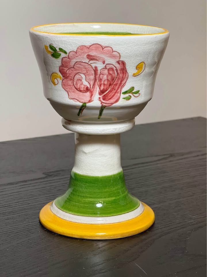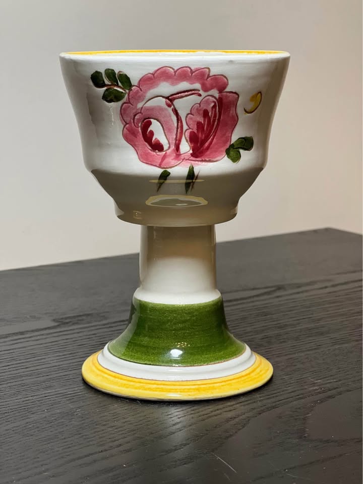 These are vintage Stangl Pottery goblets in the "Wild Rose" pattern. The Wild Rose pattern was designed by Kay Hackett and was produced by Stangl Pottery from 1955 to 1967. Stangl Pottery was known for its hand-painted designs, and each piece in the Wild Rose pattern features incised lines and raised details. The company was originally founded as Fulper Pottery in New Jersey and was later renamed Stangl Pottery. Vintage Stangl pottery is often used for display due to its age and hand-painted glazes, though it was originally made for everyday use. Sold as is. See photos for imperfections.