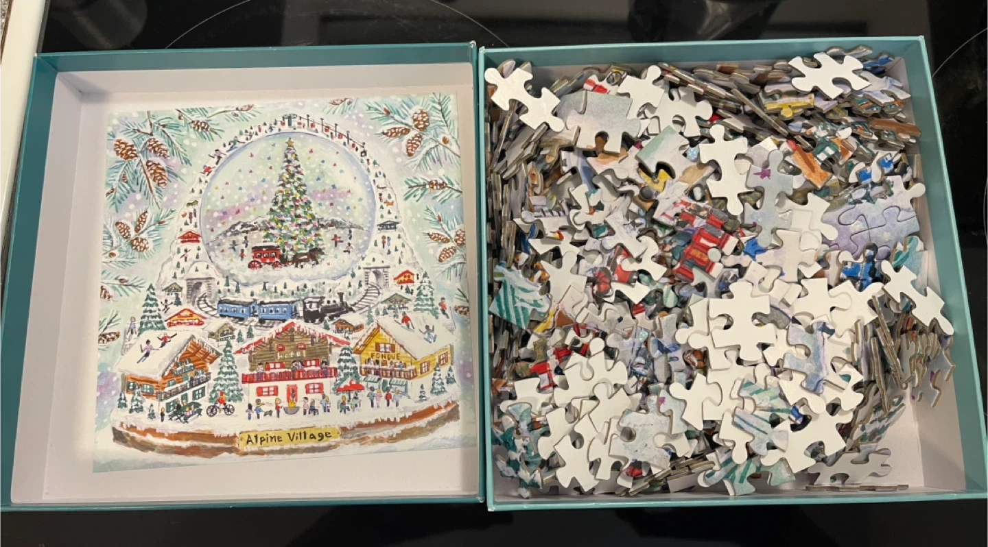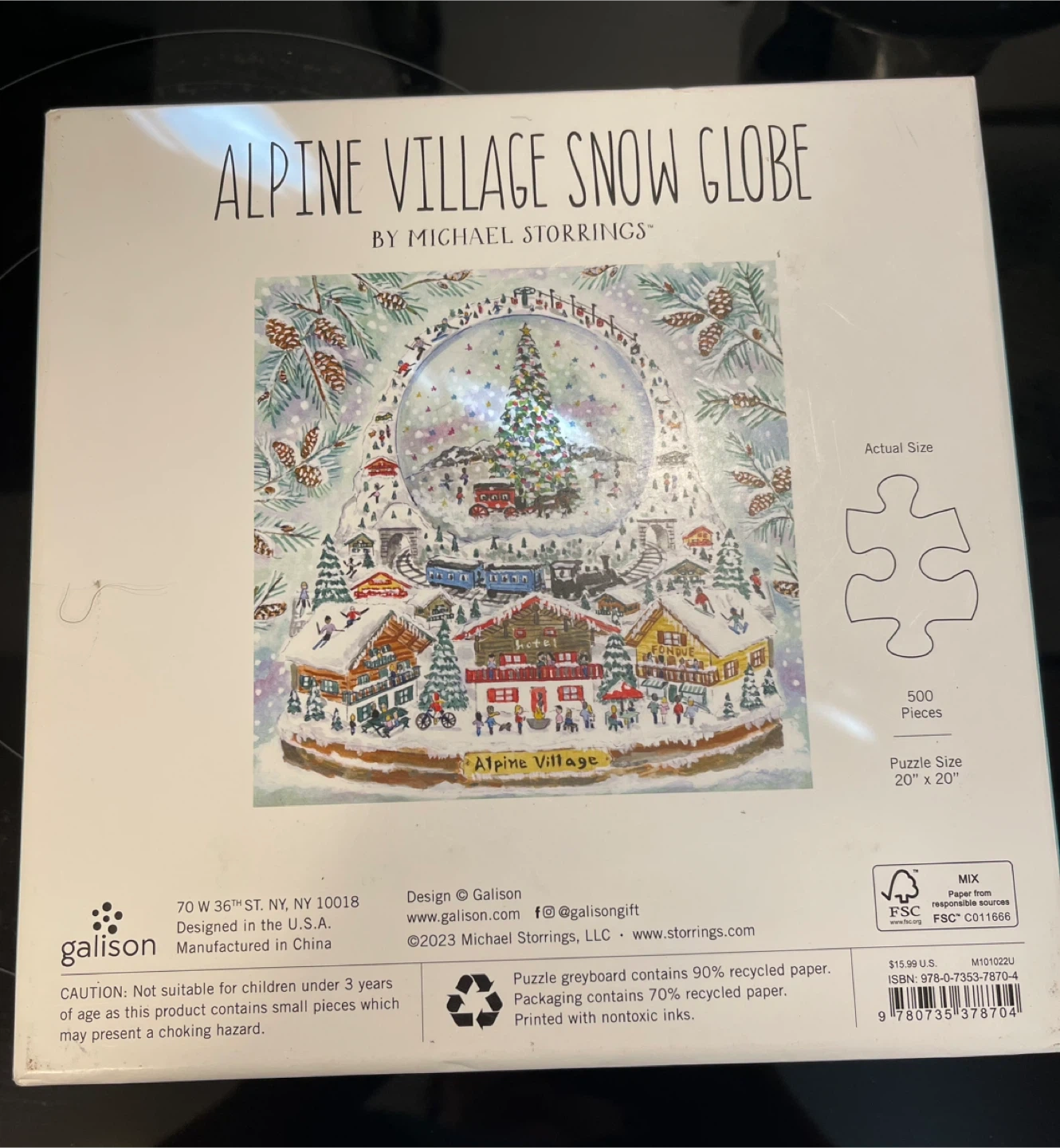 Selling a Galison Alpine Village Snow Globe puzzle. It's a 500-piece foil puzzle with a charming winter scene. The puzzle size is 20" x 20". It's designed by Michael Storrings. The puzzle and packaging contain recycled paper and are printed with nontoxic inks.