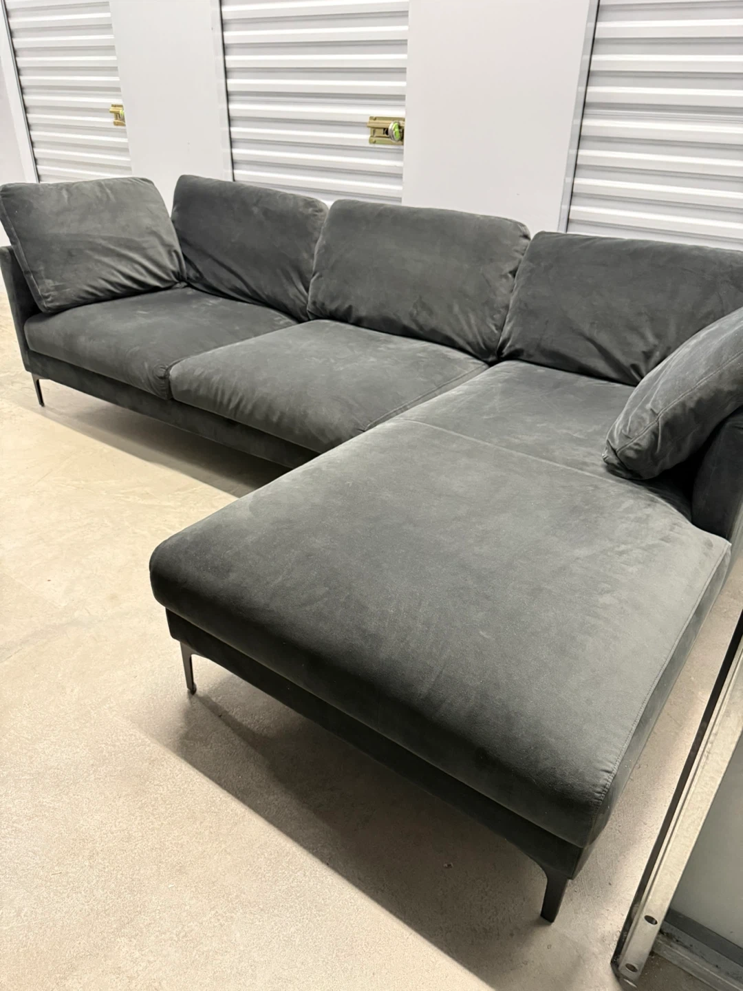 73Selling a comfortable gray sectional sofa. It's in good condition and would be a great addition to any living room. The material is soft and the cushions are plush, making it perfect for lounging and relaxing. It's a stylish and functional piece of furniture! 2k+ new Dimension: W102.4" x D35.4"/65.7" x H33.1" Seatable width: 78.7" Seating depth: 23.6"/53.9" Seating height: 16.9" Couch can be split as shown and locks into place. Extremely comfortable!!!
