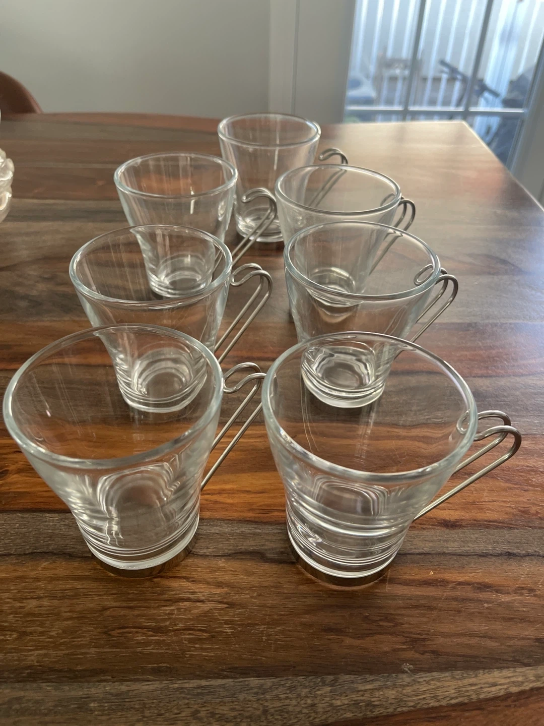 Selling a set of seven glass coffee/tea cups, each with a sleek metal holder. These are perfect for enjoying a little pick-me-up! They're in great shape and ready for a new home