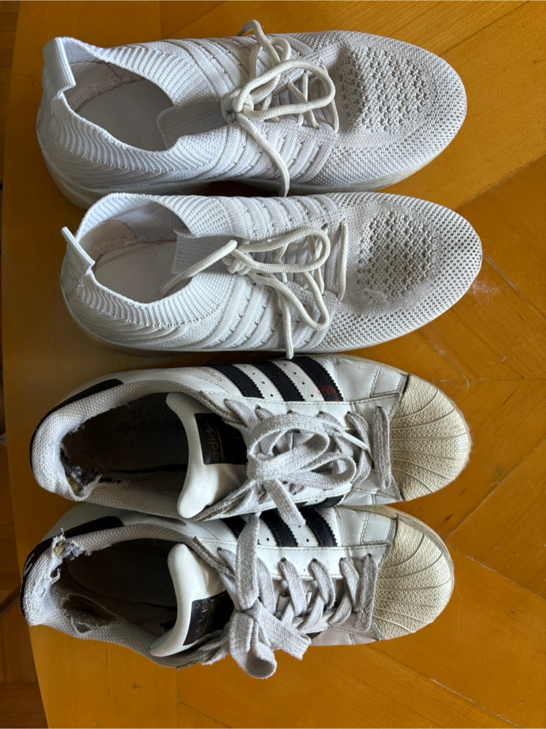 Selling a pair of Adidas Superstar sneakers and a pair of white knit sneakers. Both show signs of wear, as seen in the photos