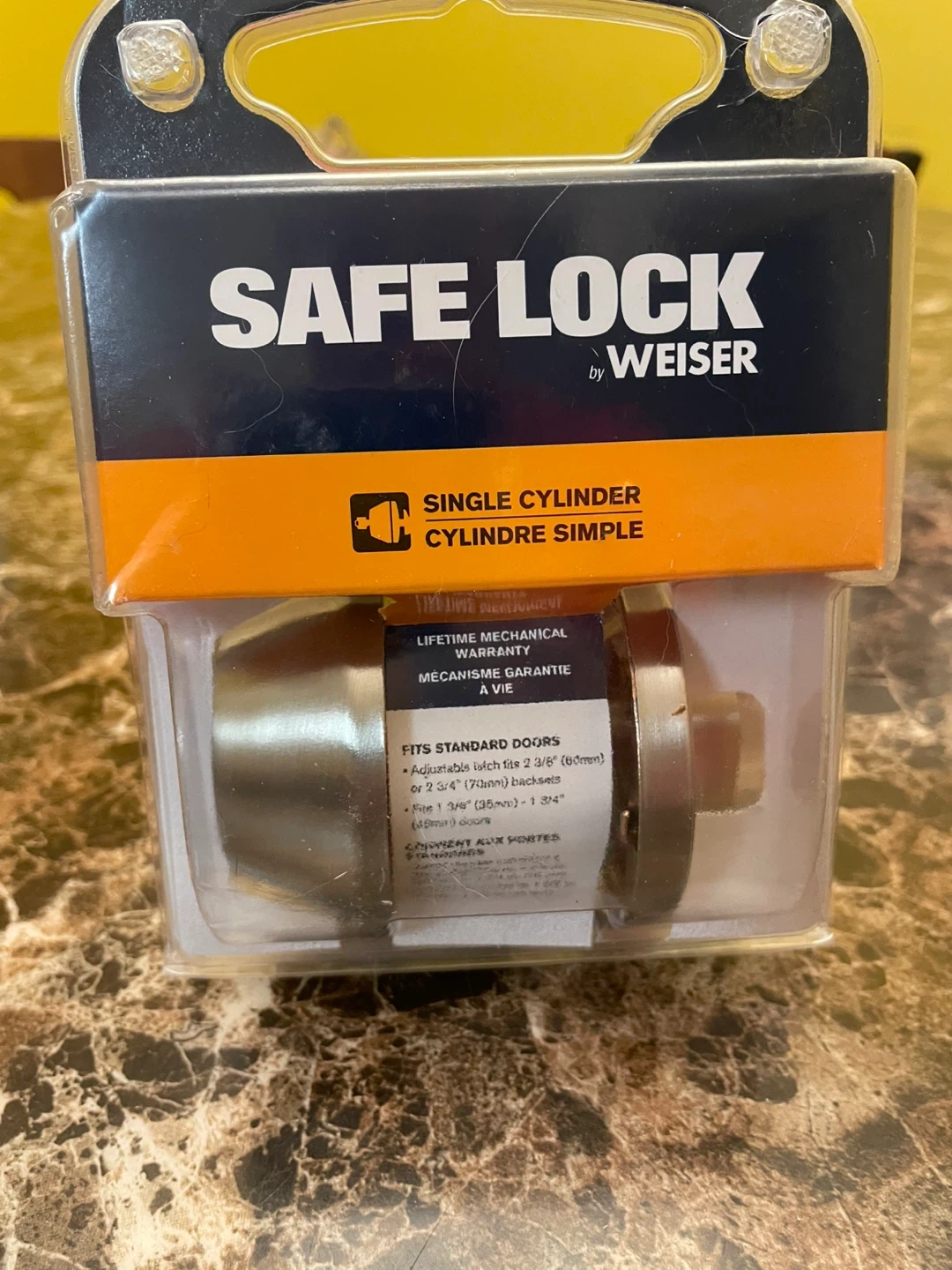 Selling a new Weiser Safe Lock door knob! It's a single cylinder style and fits standard doors with an adjustable latch that fits 2 3/8" (60mm) or 2 3/4" (70mm) backsets