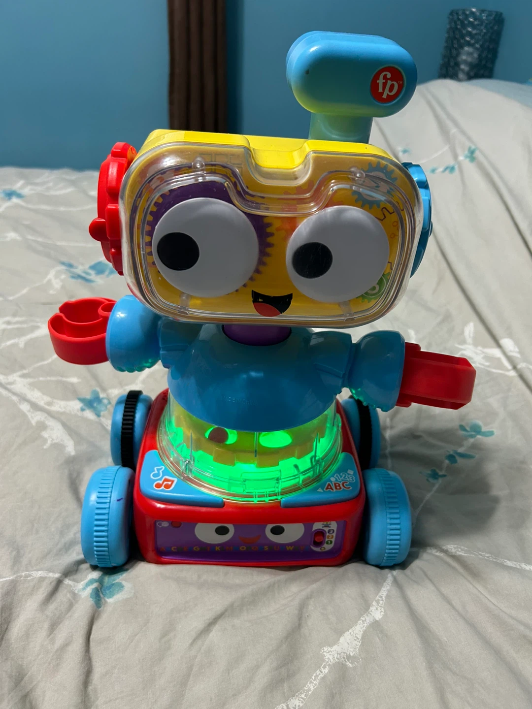 Selling a Fisher-Price Happy Heureux robot toy! It's in great condition and ready for a new home. This interactive toy is perfect for little ones who love to explore and learn. It features bright colours and fun sounds to keep your child entertained, it even crawls forward and backwards to encourage your little one to crawl and dance along!