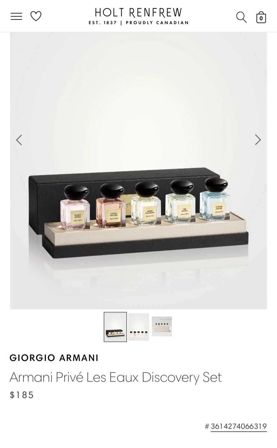 Selling a set of Armani Prive Haute Couture fragrances! The set includes five different scents. The fragrances are in their original packaging $185. Plus taxes.