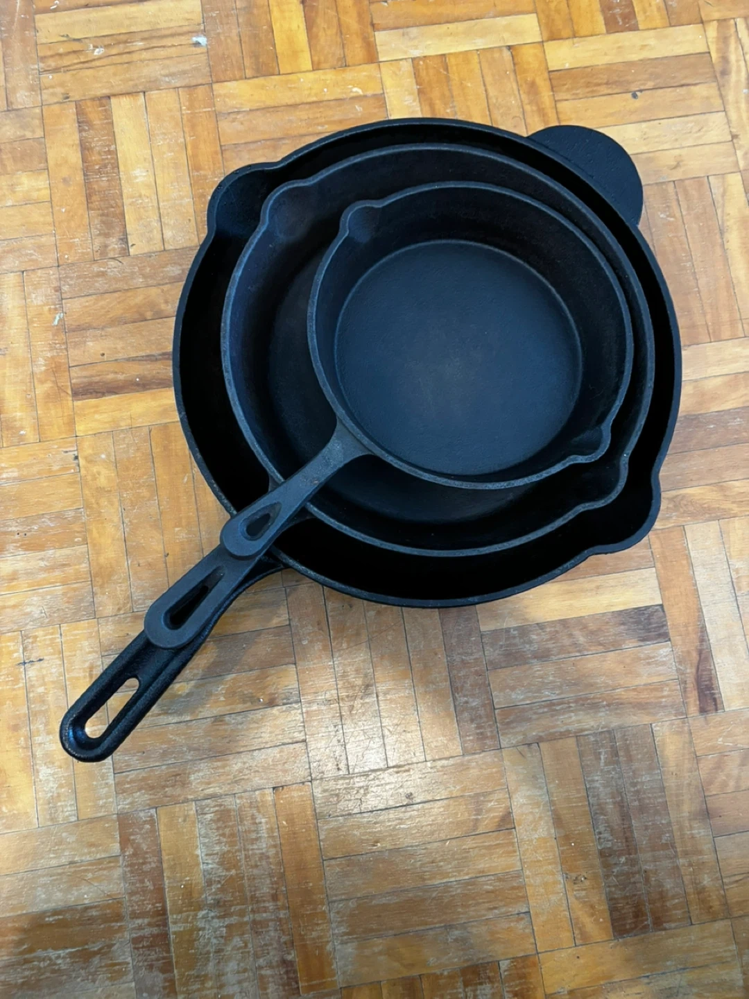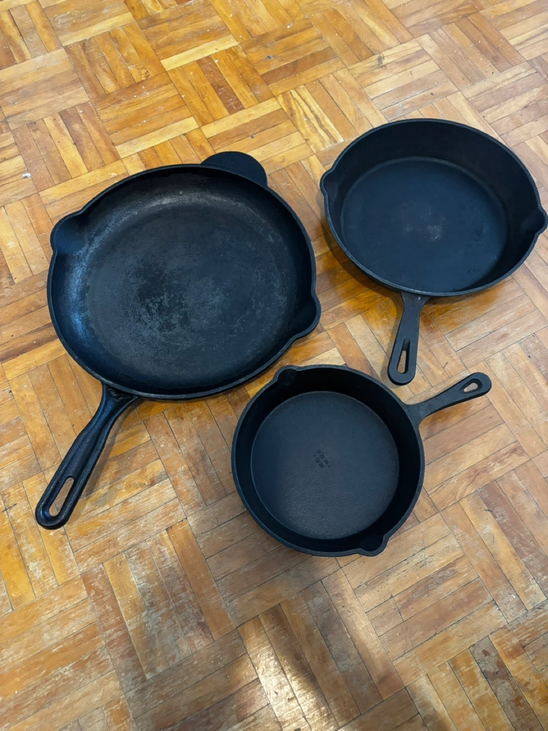 1000+Selling a set of cast iron skillets, perfect for cooking up a storm! Included is a bottle of Clark's Cast Iron Oil to keep them seasoned and ready to go, as well as a grill press for perfectly pressed sandwiches and more