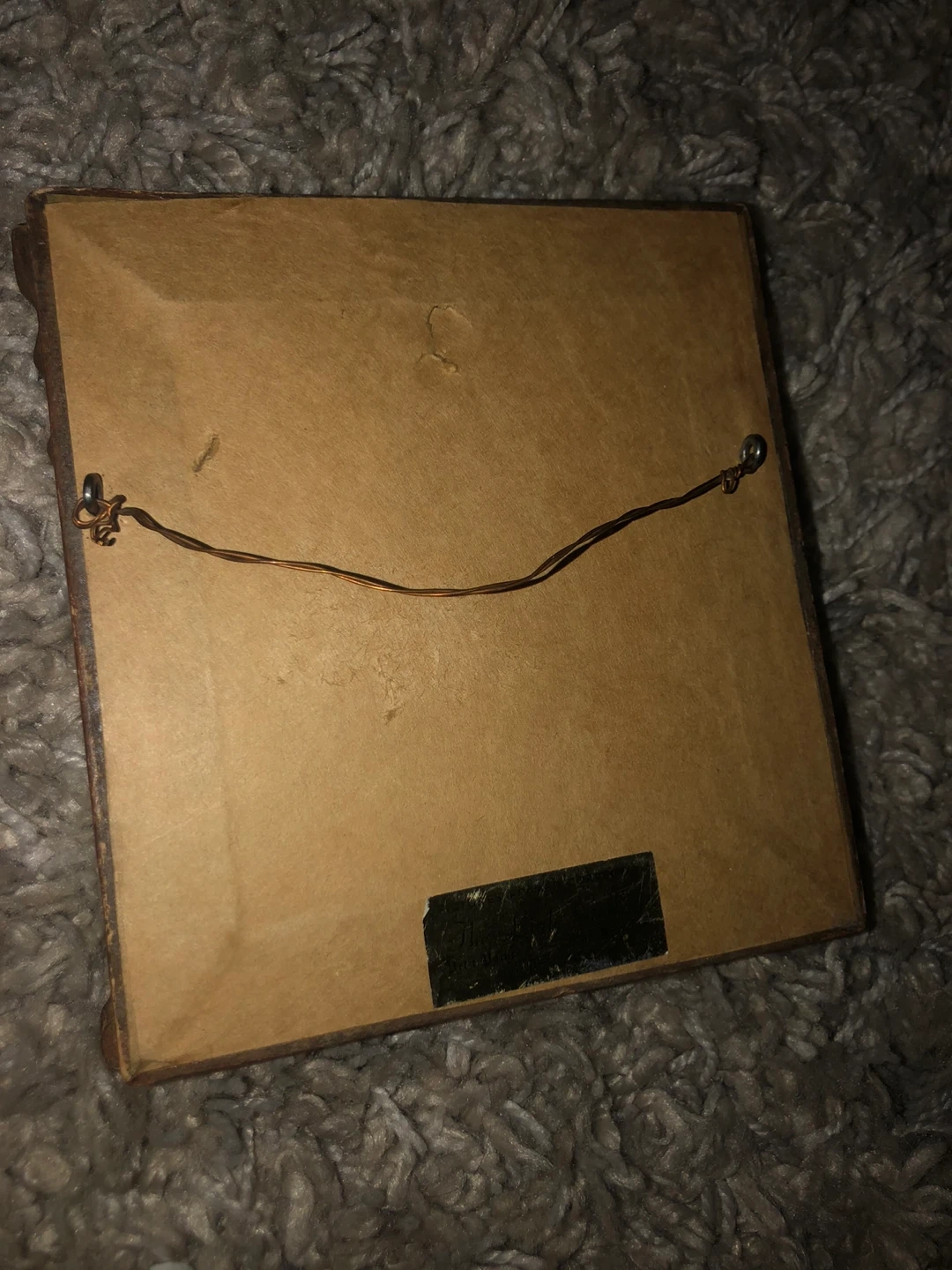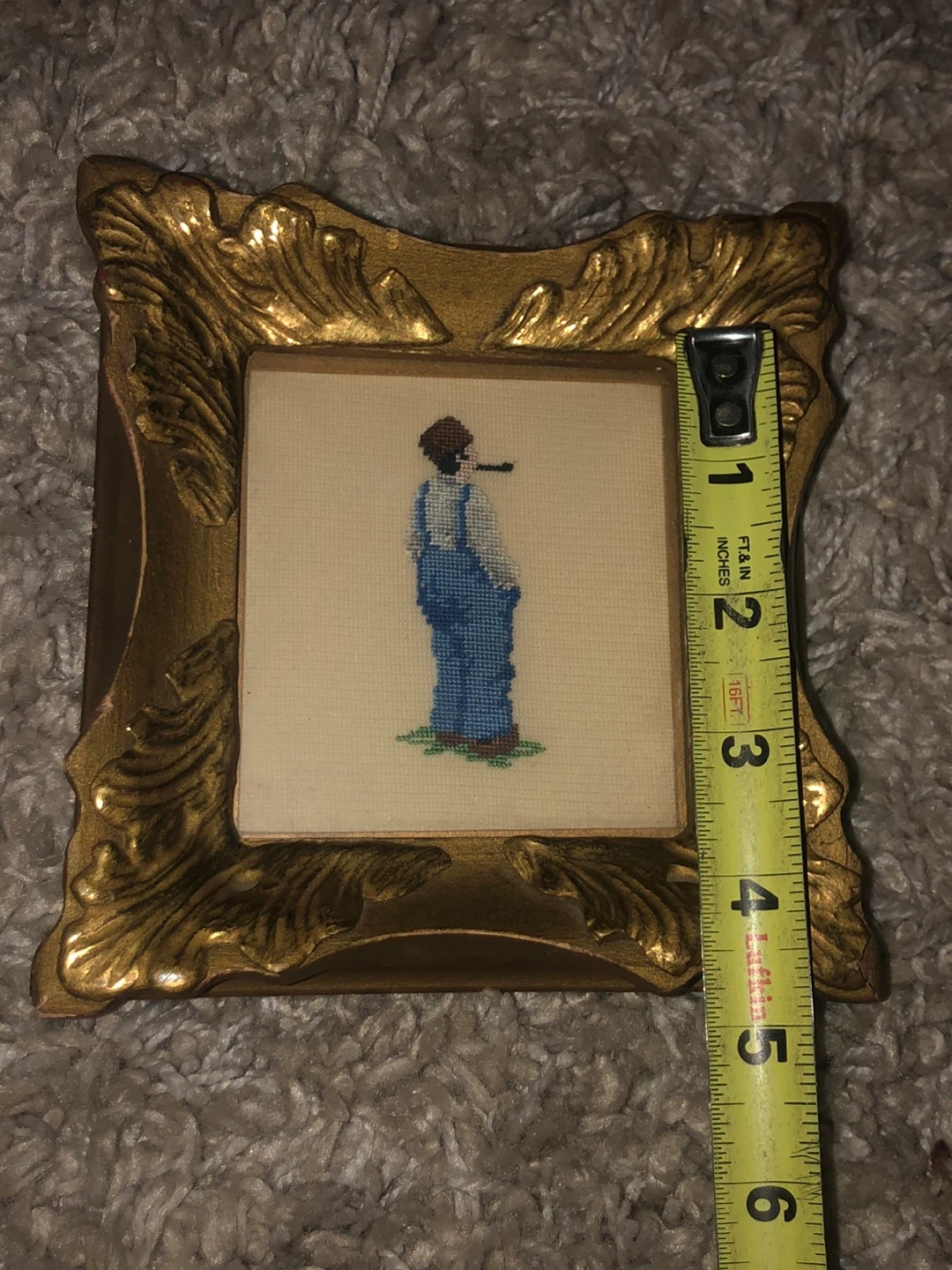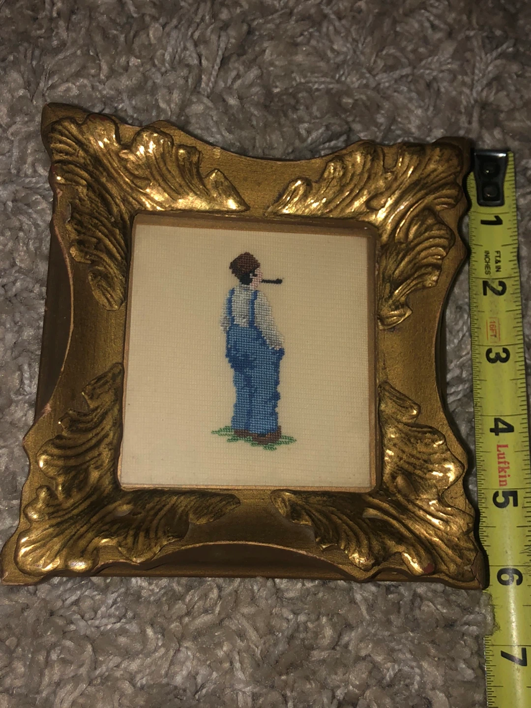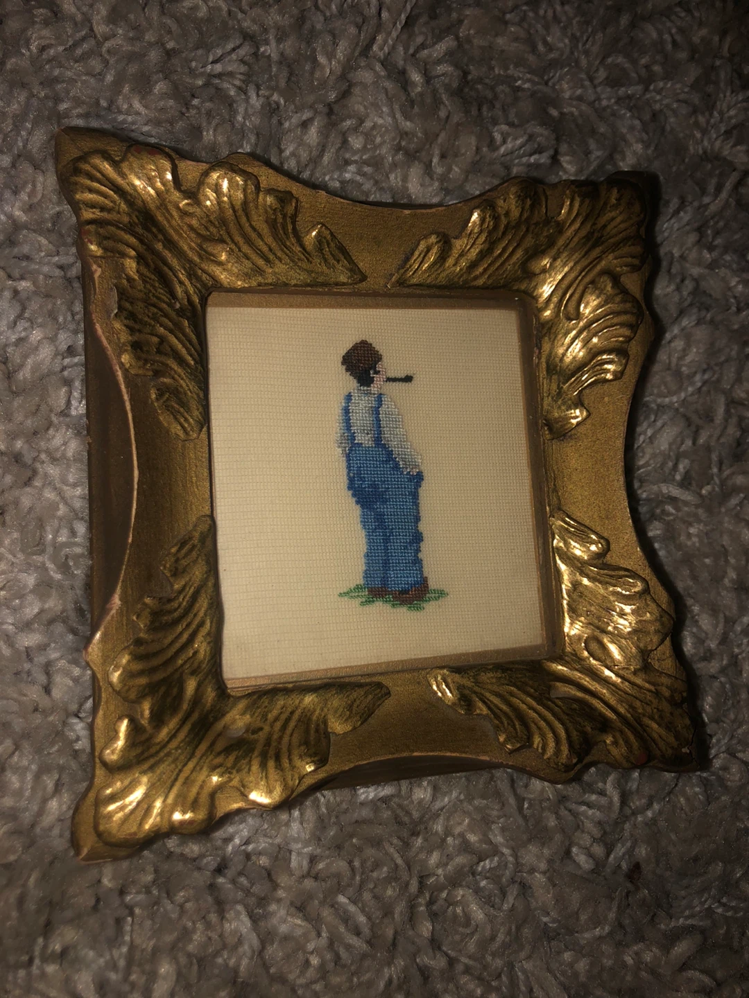 This is a framed needlepoint piece of art. The frame is gold and the art depicts a man in overalls smoking a pipe. It is approximately 4 inches by 4 inches.