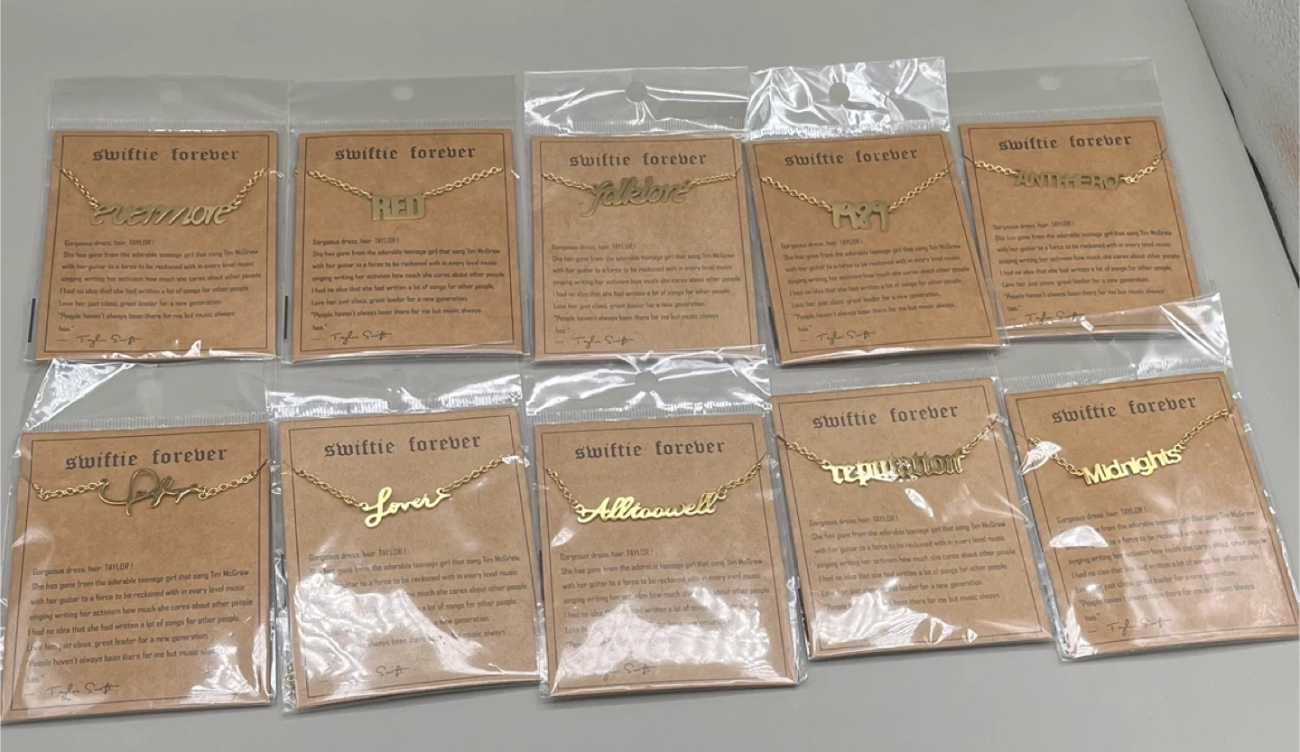I have some super cute Taylor Swift inspired necklaces! Each one features a different album name. They're brand new and still in their packaging, perfect for any Swiftie!