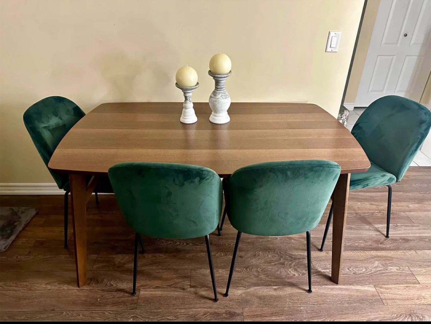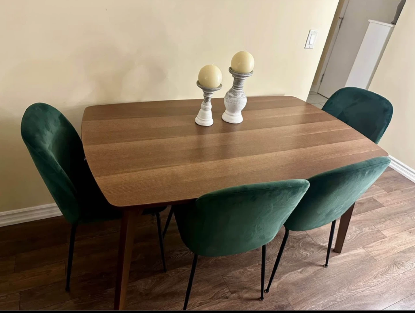 Selling a set of four beautiful green velvet dining chairs and structube table. They're in great shape and would add a touch of elegance to any dining room or kitchen! It’s used but in excellent condition.I’m open to offers and depending on location can deliver