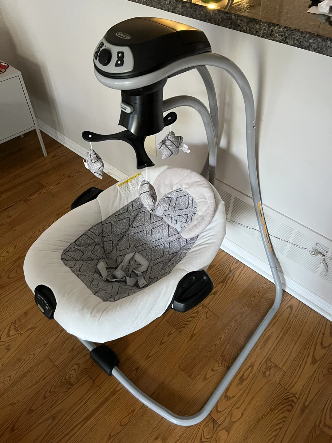 Gently used Graco baby swing in great condition! It features a comfortable seat and overhead mobile with hanging toys to keep your little one entertained. Perfect for soothing and relaxing your baby.