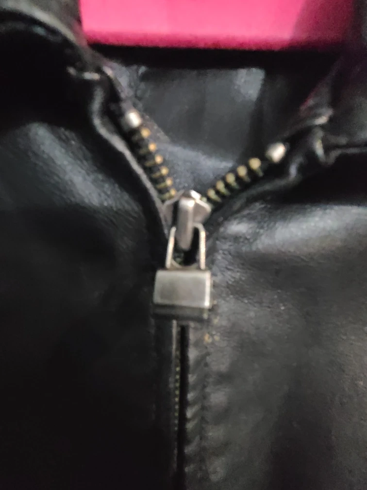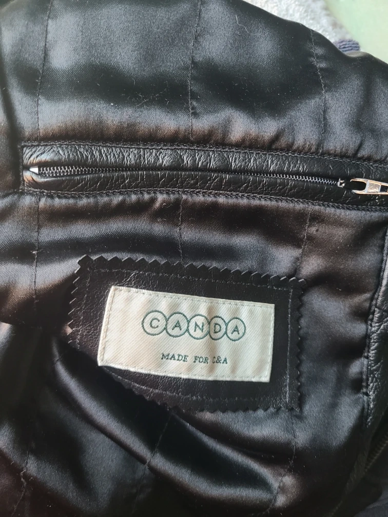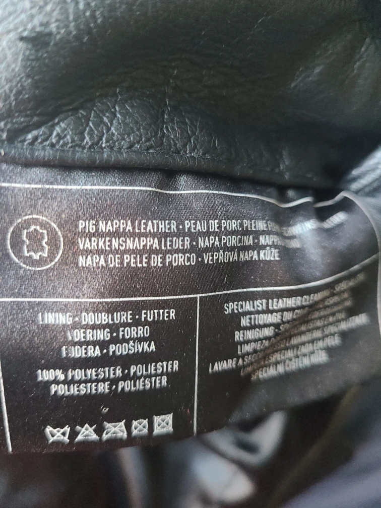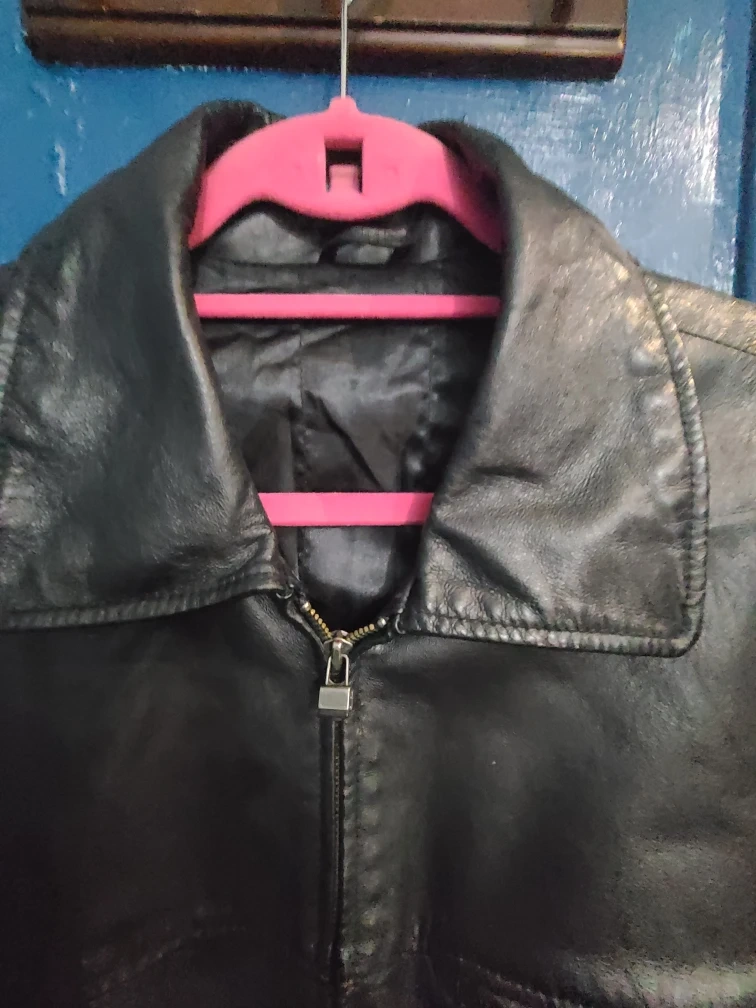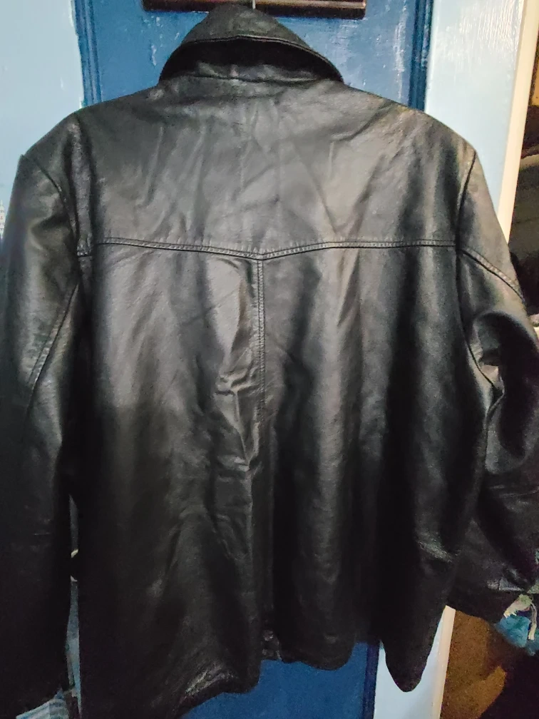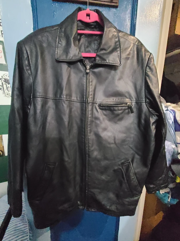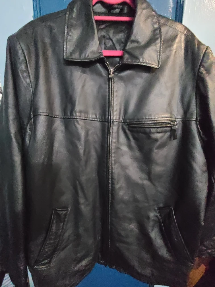 Selling a black leather jacket from Canda. The outer material is pig nappa leather and the lining is 100% polyester. 24 in wide at the shoulders, Sleeves is 23 in and the length is 31 inches.