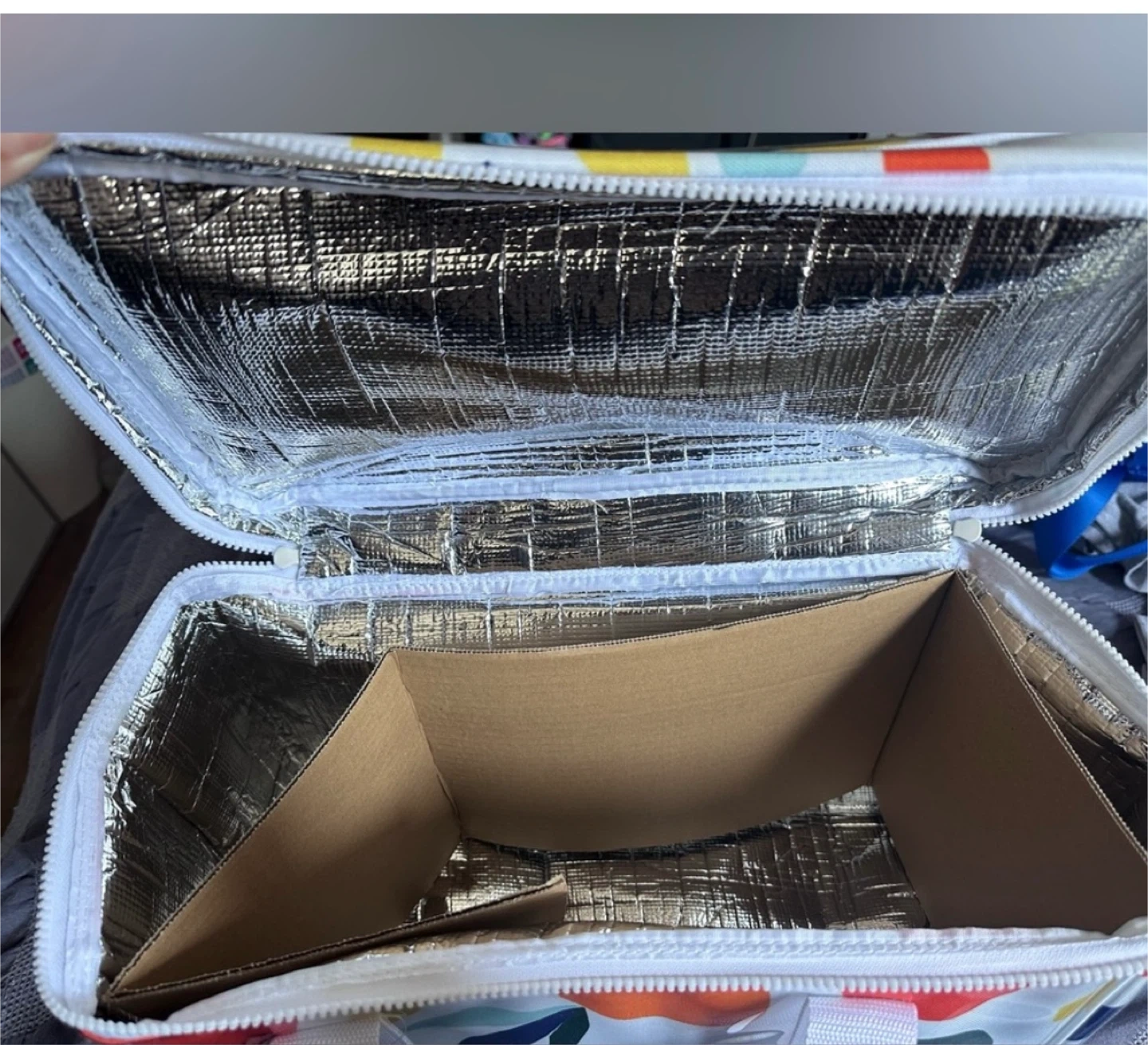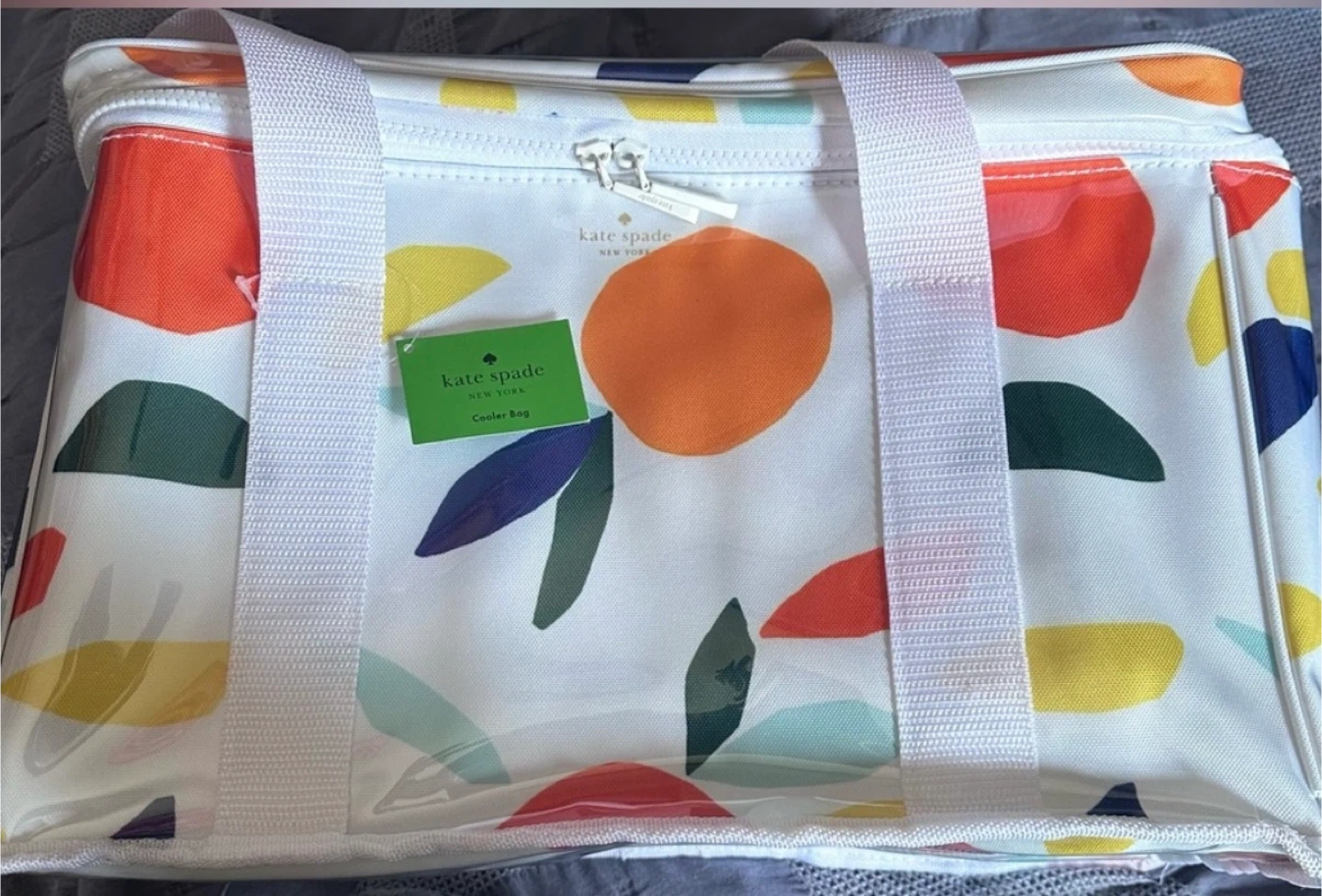 I have a brand new Kate Spade cooler bag for sale! It's got a fun, colorful design with oranges and leaves. The inside is lined to keep your food and drinks cool. Perfect for picnics, beach trips, or just keeping your lunch fresh!