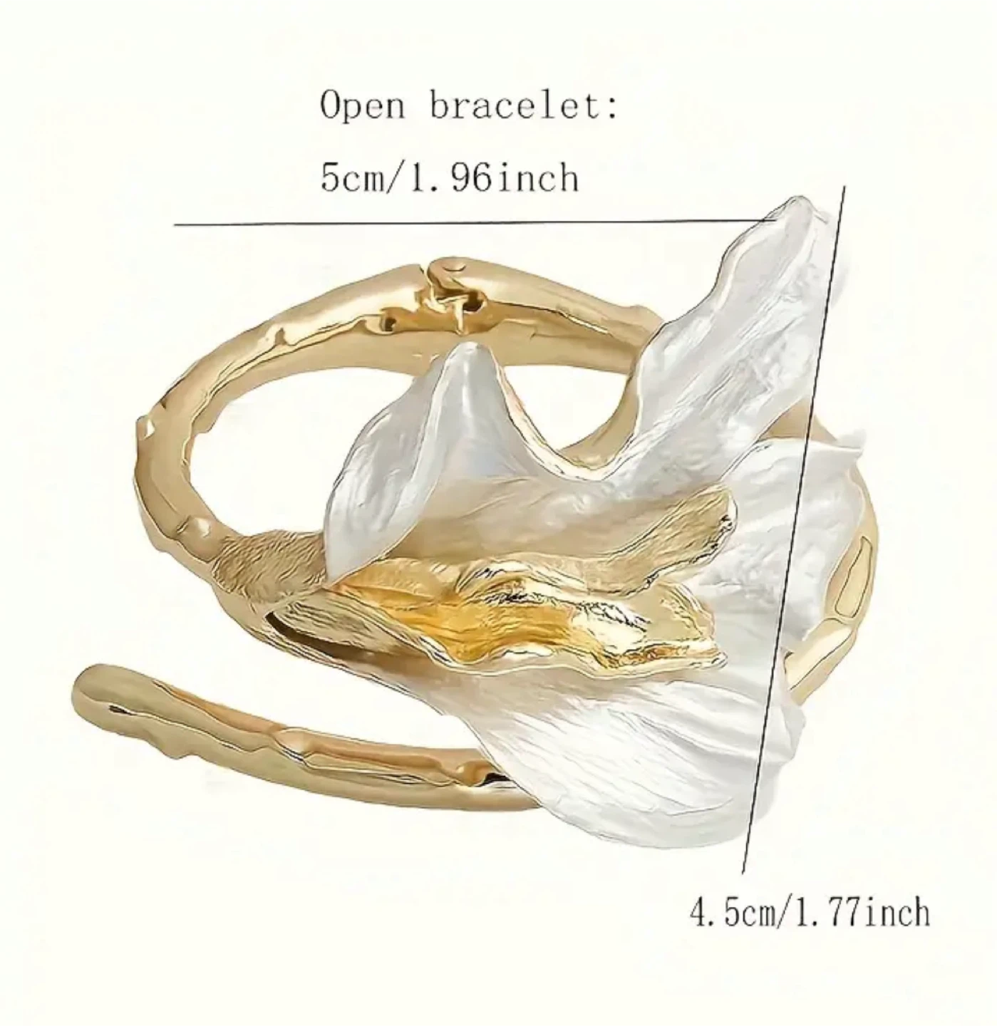 Selling a beautiful floral cuff bracelet! It features a unique open design with a gold-tone band and a white floral accent. The bracelet is approximately 1.96 inches in diameter, making it a stylish statement piece for any outfit