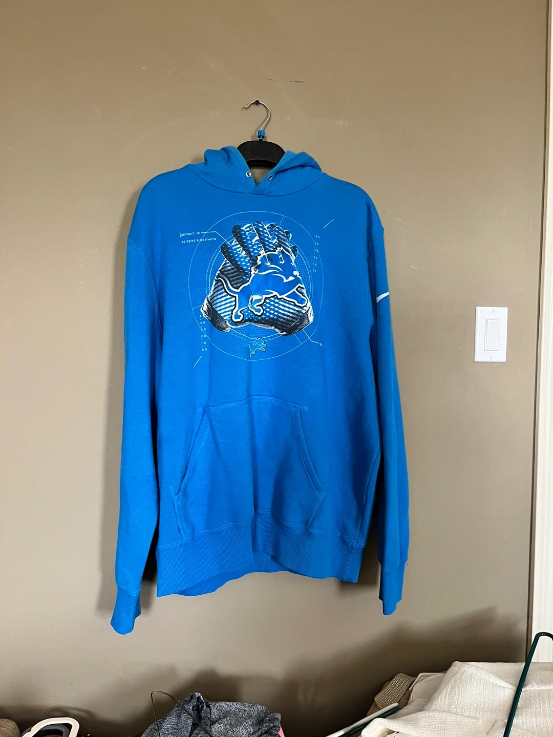 10Selling a Nike NFL Detroit Lions hoodie in size XXL. It's a vibrant blue and features a cool graphic design on the front. Great for any Lions fan!