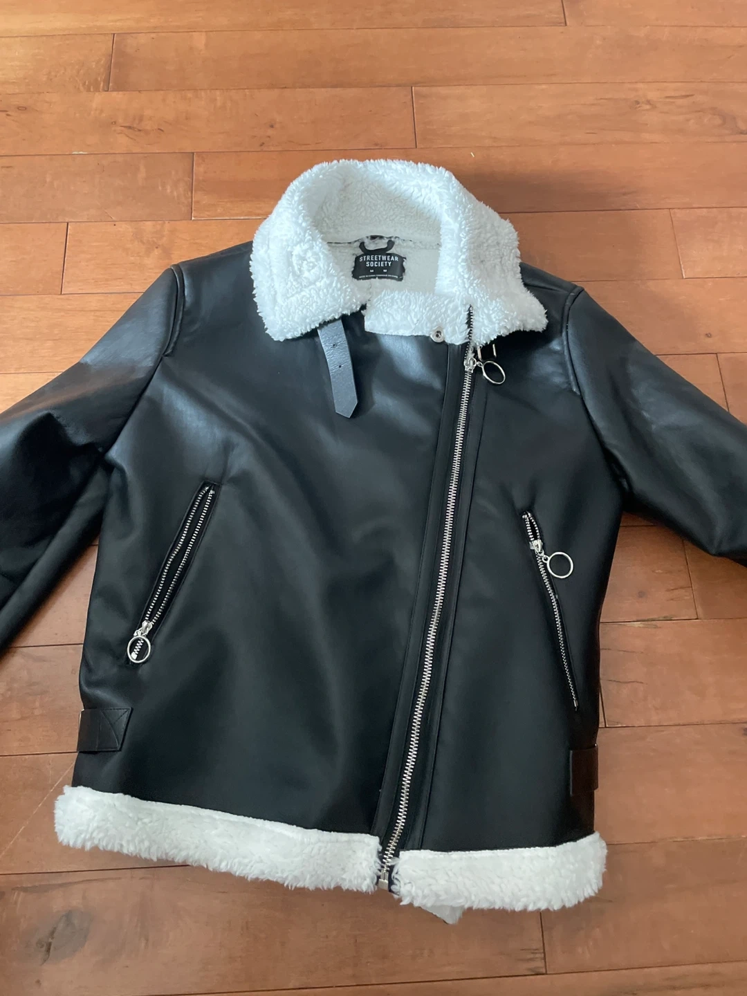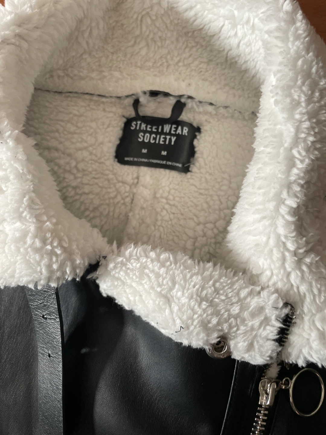 Here's a cool aviator jacket from Streetwear Society! It's a size medium and features a black faux leather exterior with a cozy white sherpa lining and trim. Perfect for adding a bit of edge to your wardrobe!
