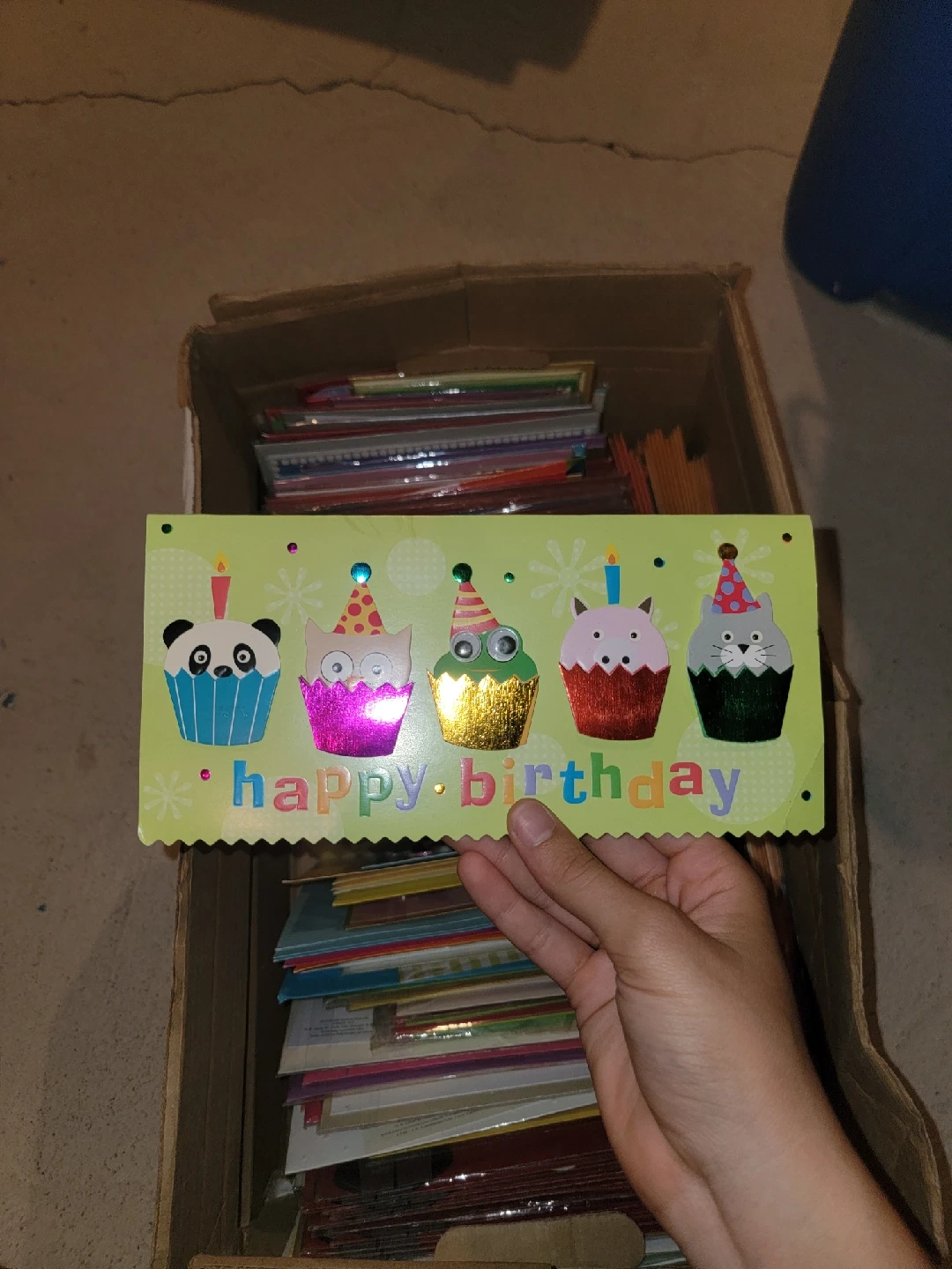 I have a box filled with assorted greeting cards for sale! There's a variety of designs and themes, perfect for any occasion. A few are Papyrus brand.