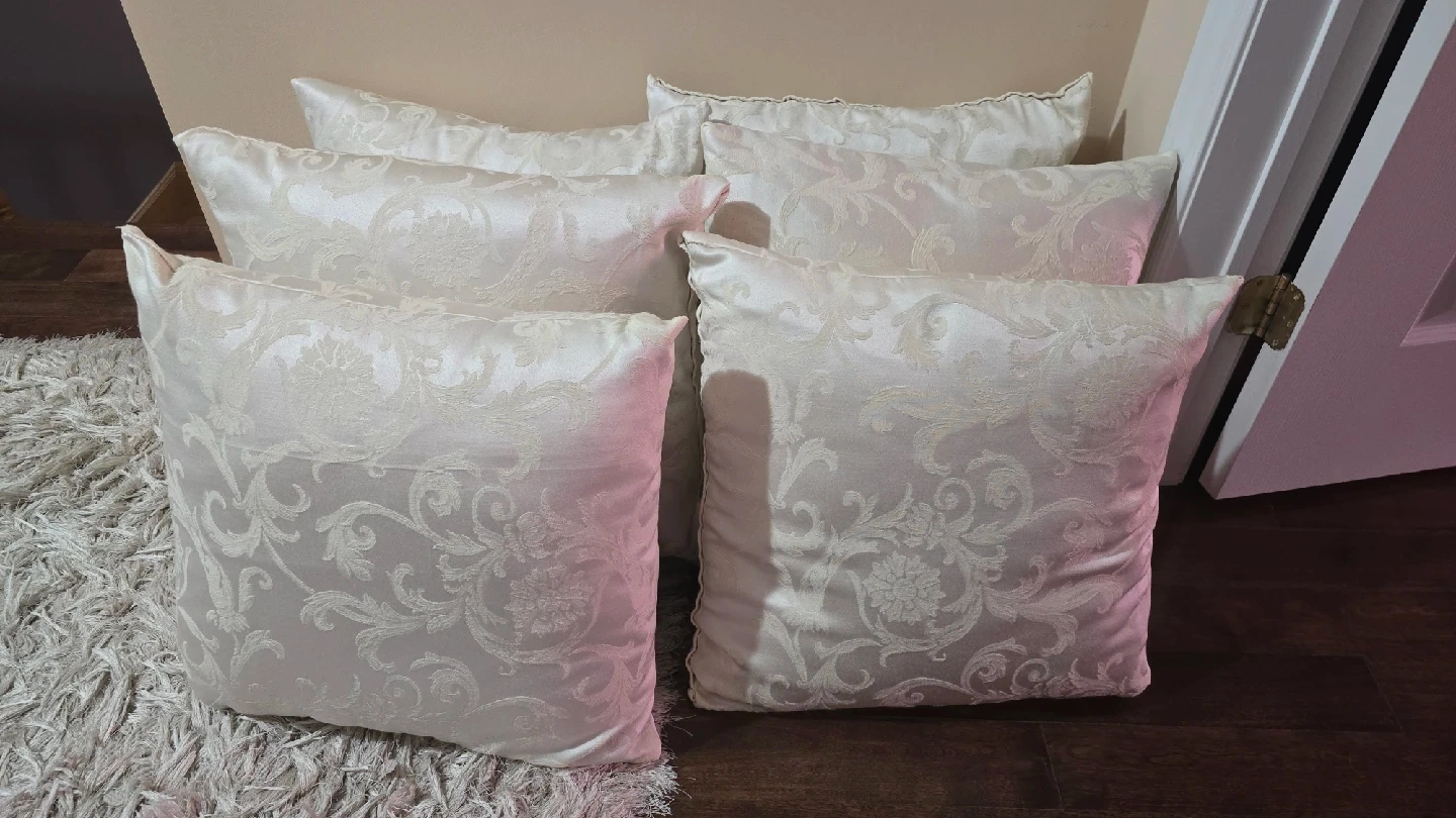 18Selling a set of six decorative throw pillows. They have a lovely floral pattern and a subtle sheen. Perfect for adding a touch of elegance to your living room or bedroom! all for 20