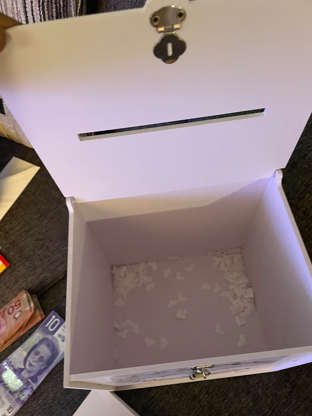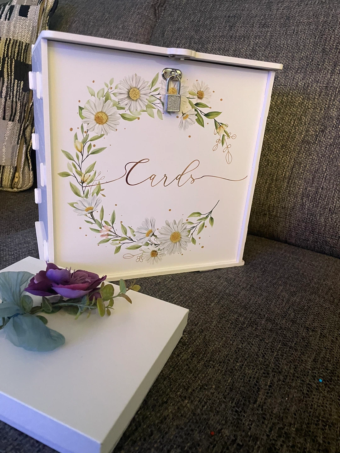 Selling a lovely white wedding card box! It features a beautiful daisy floral design and comes with a lock to keep your cards safe. Perfect for adding a touch of elegance to your special day. Pick up from Etobicoke near Albion Mall. Open to offers.