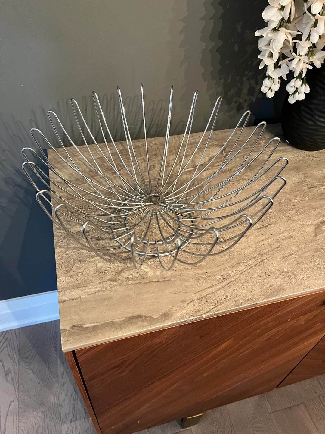 77Selling a stylish silver wire fruit bowl. It's in great shape and would look lovely on any countertop or table! It's perfect for holding fruit or even as a decorative piece on its own 15” diameter