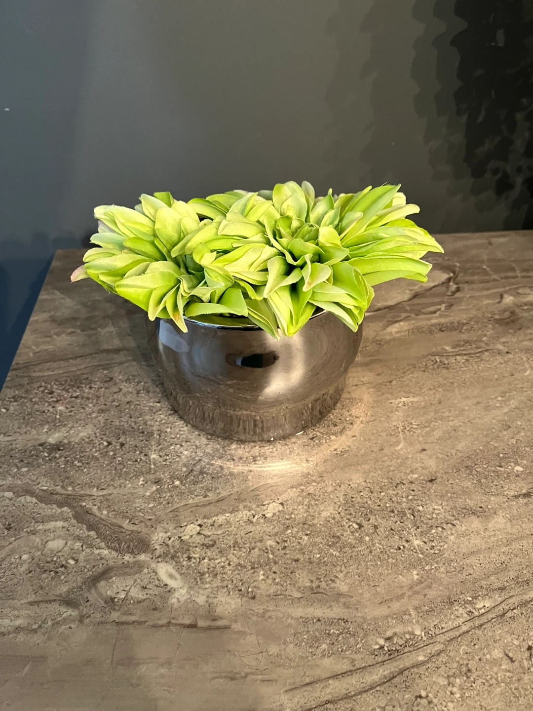 77A lovely artificial green floral arrangement in a silver-tone pot. It's in great condition and would add a touch of freshness to any room 5” tall x 7 “ diameter