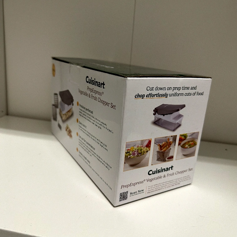 95I'm selling a brand new Cuisinart PrepExpress Vegetable & Fruit Chopper Set! It's a 4-piece set that's perfect for cutting down on prep time and chopping effortlessly uniform cuts of food. The box includes everything you need, such as a large slicer, container, and cleaning tool. It's multipurpose, making kitchen tasks easier and reducing effort