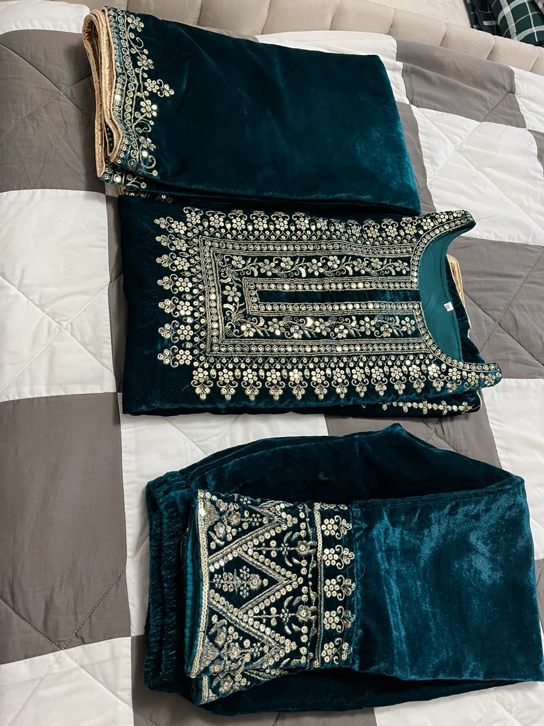 Selling a beautiful emerald green velvet salwar kameez suit! The suit features intricate embroidery and comes with matching pants and a dupatta. It's in great condition and perfect for special occasions