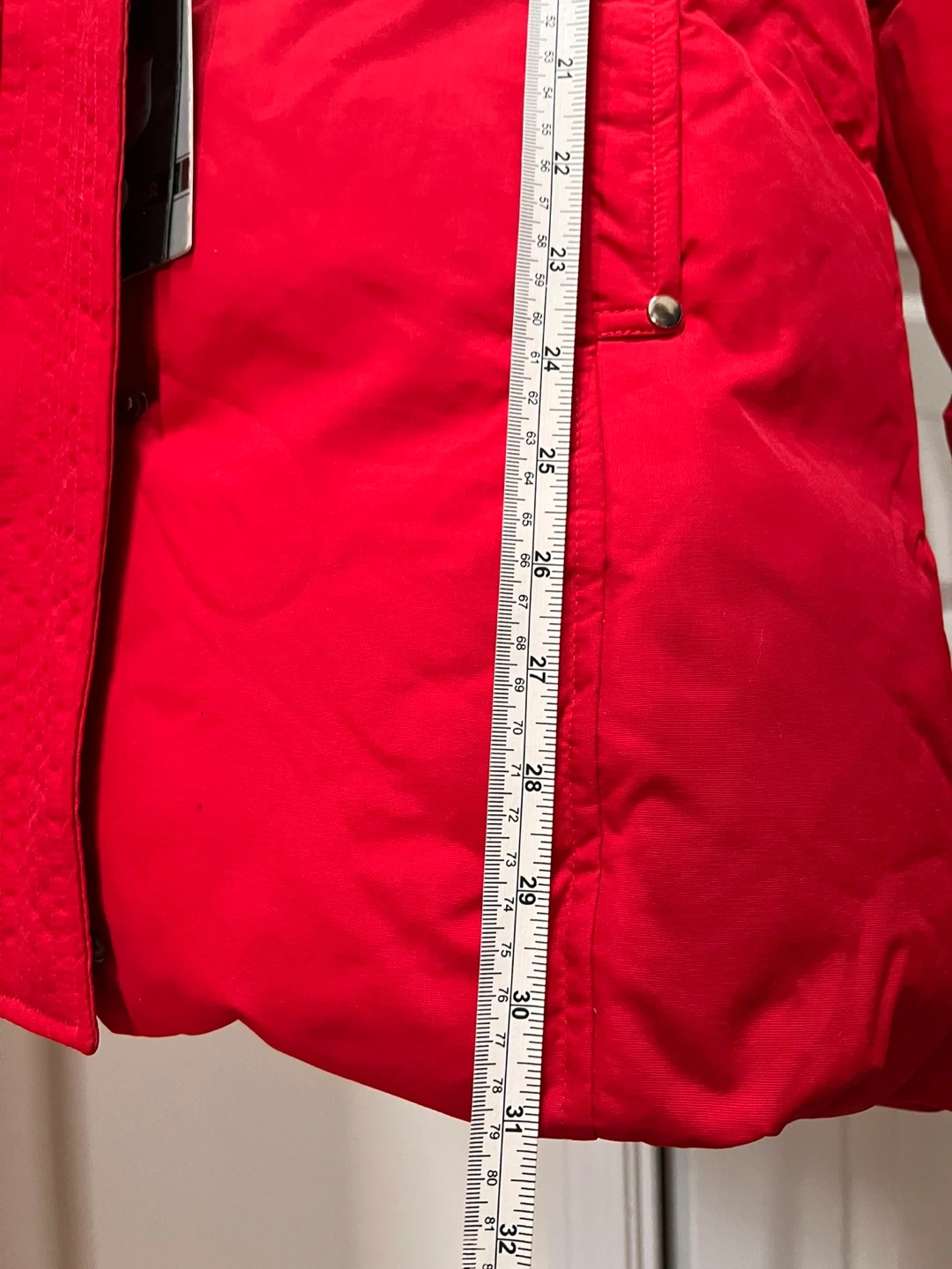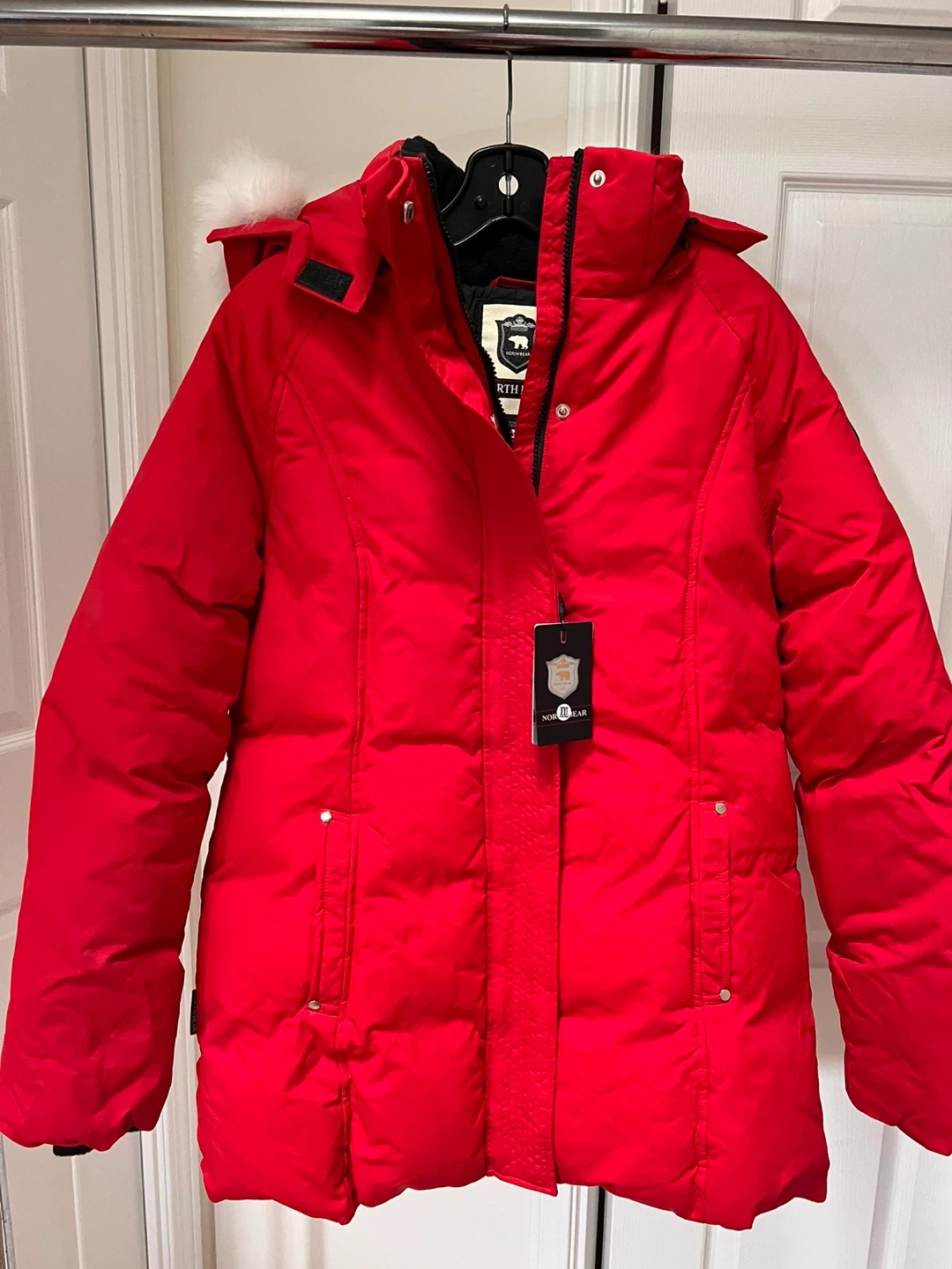 10North Bear winter jacket in size XXL. It's a vibrant red colour with a faux fur trim on the hood. Perfect for staying warm during the cold Canadian winters!