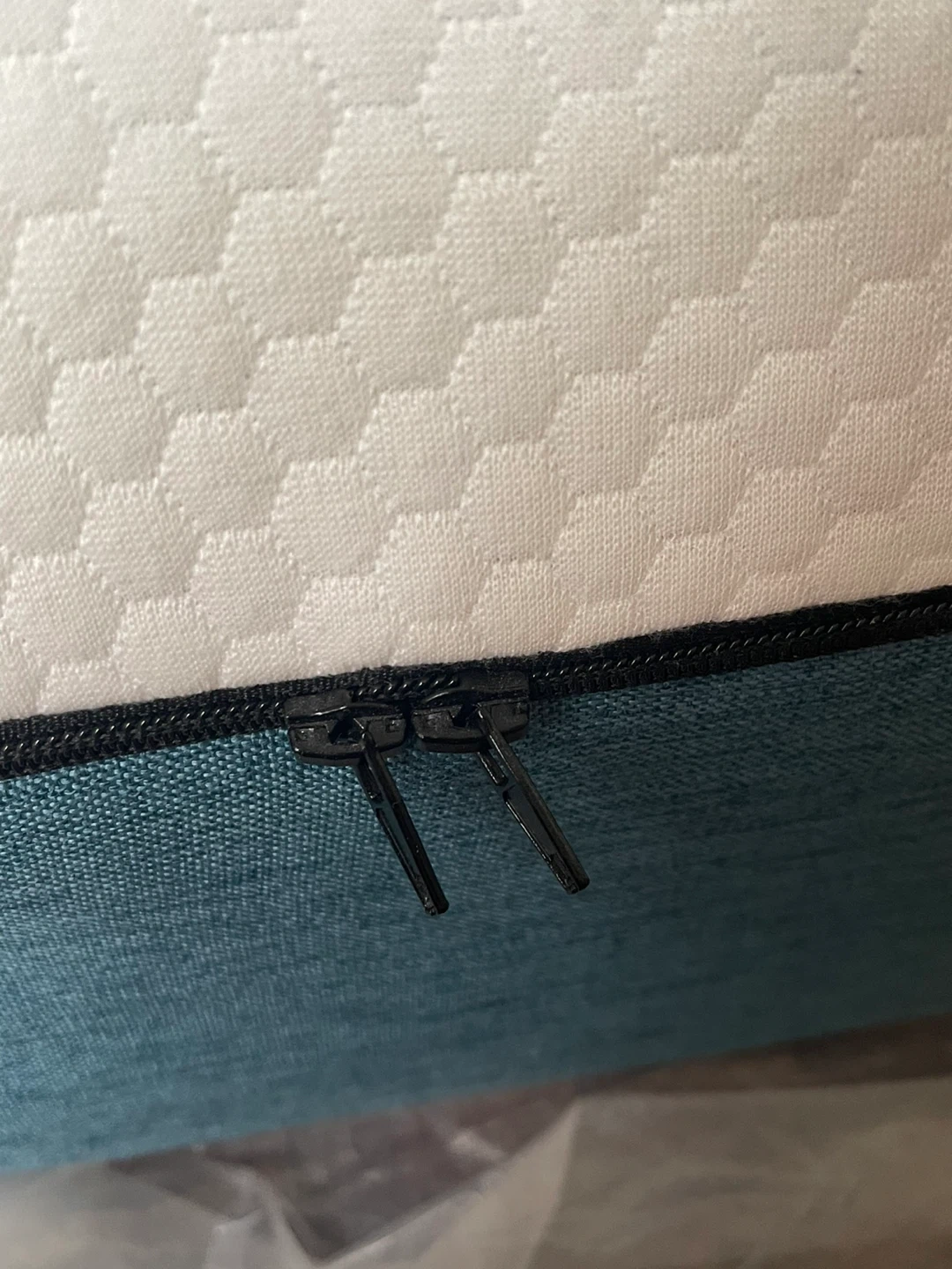 A MOLBLLY mattress with a white textured top and teal blue sides. It features a zippered cover and has a quilted pattern. Offers a comfortable sleep surface. Less than 2yrs old. Comes with a queen size comforter from IKEA too.