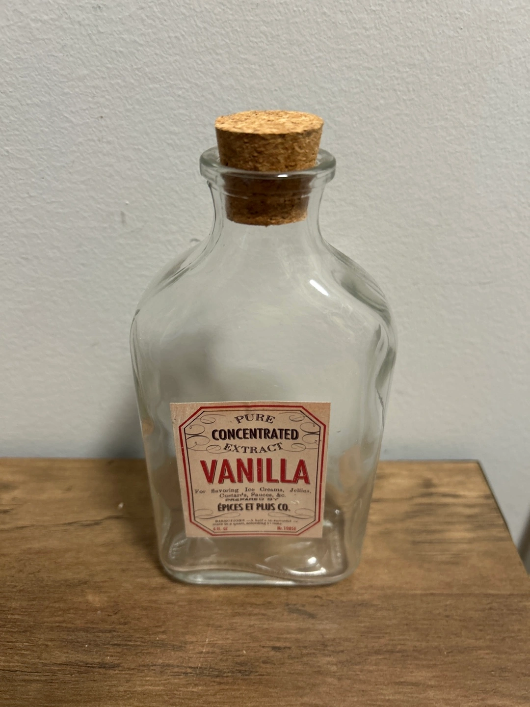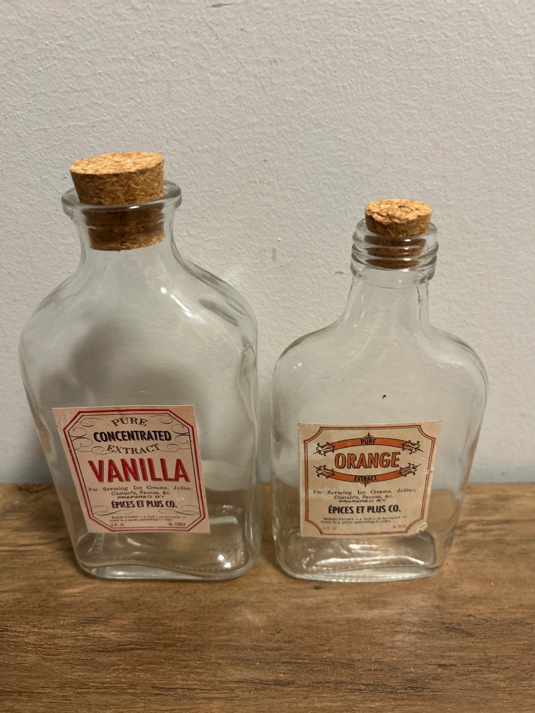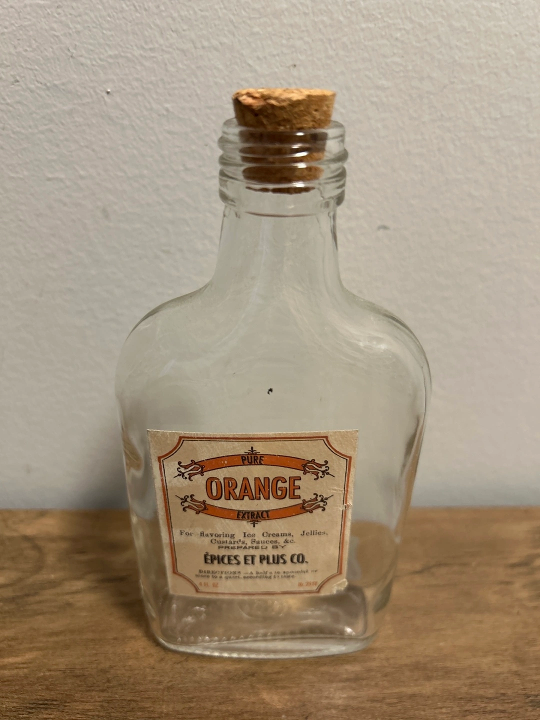 Épices Et Plus Co. pure orange extract bottle. It's for flavouring ice creams, jellies, candies, sauces, and cakes. Glass bottle with a cork stopper.