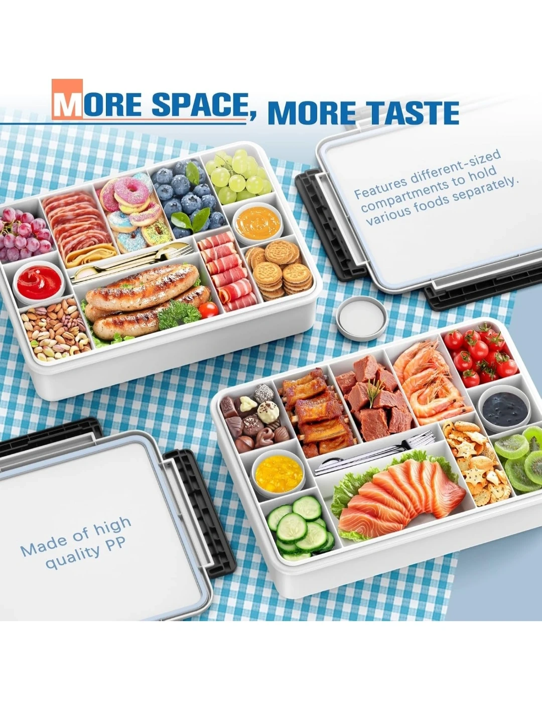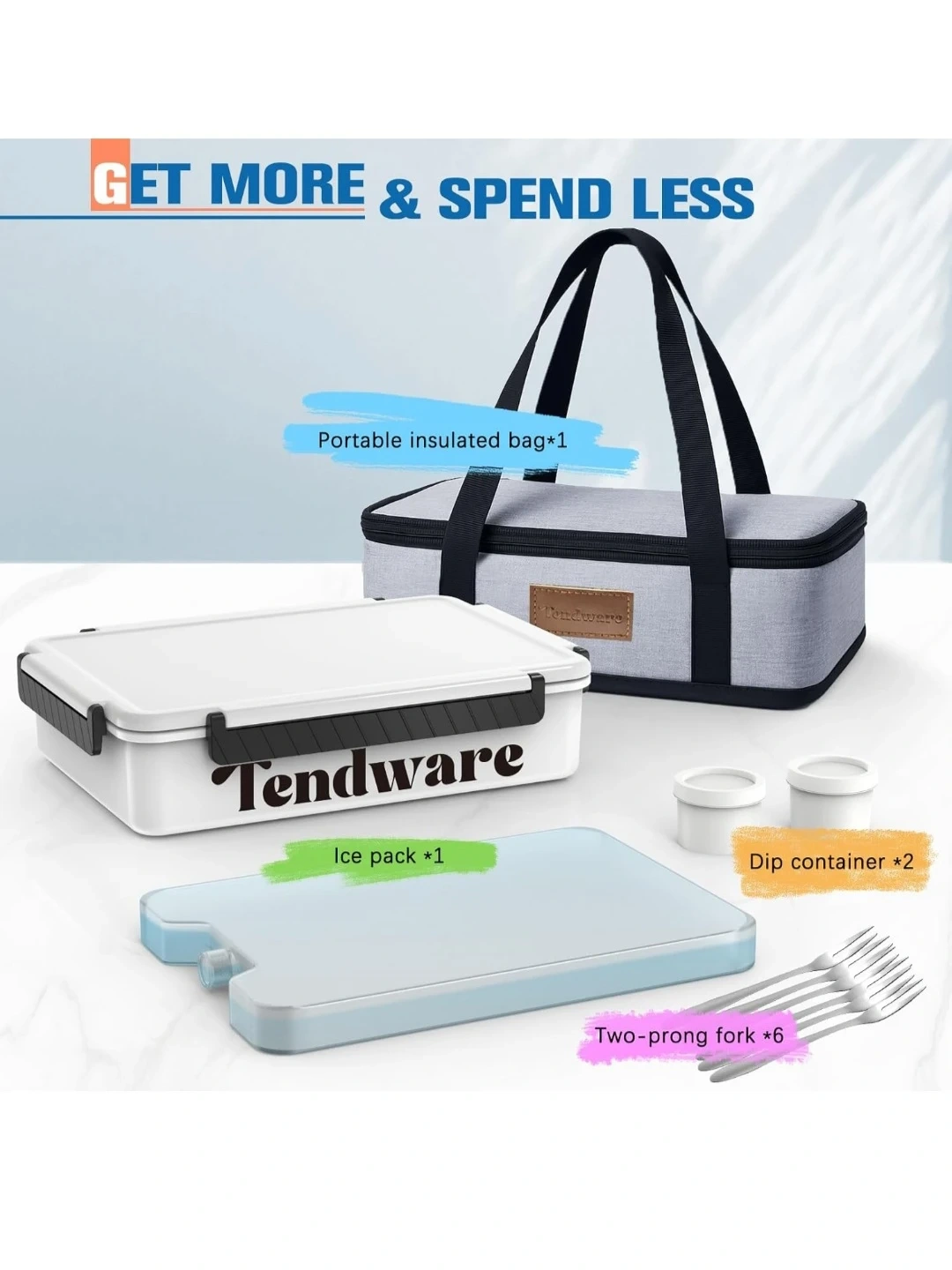 Tendware divided food container is made of high-quality PP material. It features different-sized compartments to hold various foods separately. This container is dishwasher safe and comes with an insulated bag and reusable ice pack for optimal cooling performance. It's perfect for picnics, camping, and outdoor events!