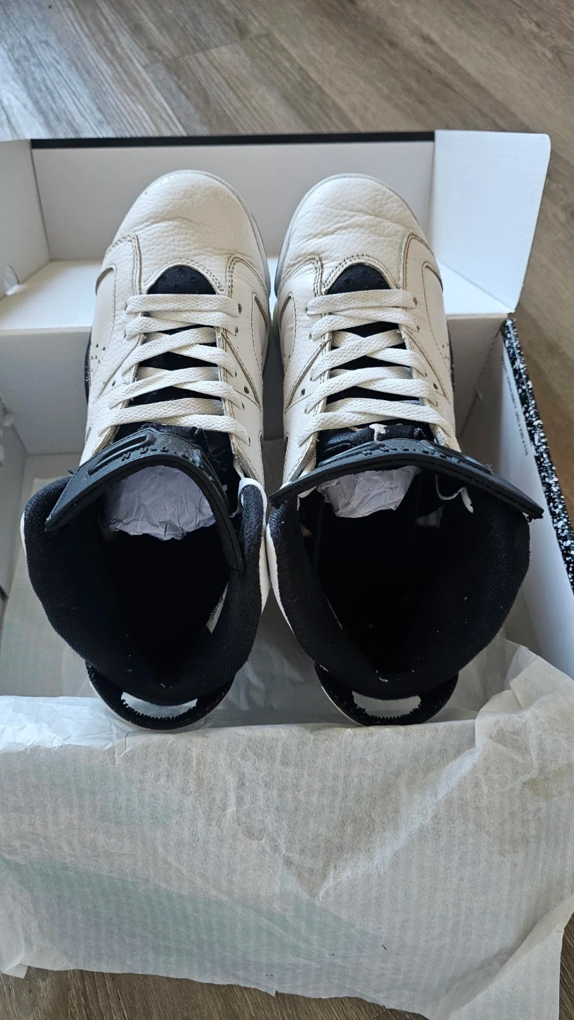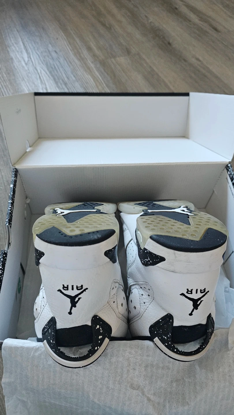 These are Air Jordan 6 Retro sneakers in GS size 6.5. They're white with black speckle accents and detailing. Includes the original box.