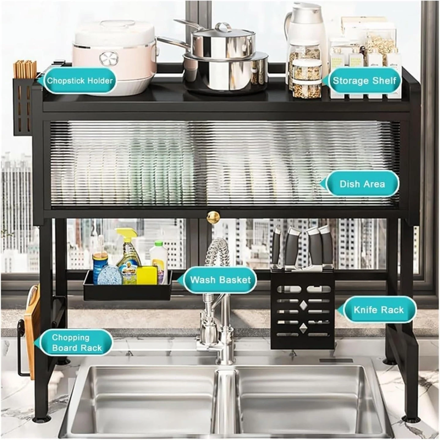 This black kitchen dish rack features a convenient cabinet for dishes and includes a chopstick holder, knife rack, wash basket, and chopping board rack. It's made of durable metal construction.