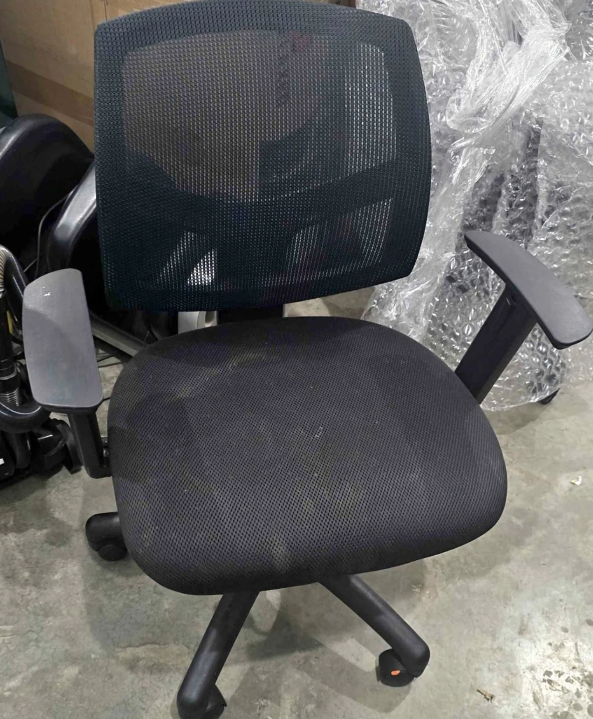 This is a black mesh office chair with adjustable armrests. It's built with a sturdy base and smooth-rolling casters for easy mobility. The breathable mesh back provides good ventilation. This chair is great for extended work sessions.