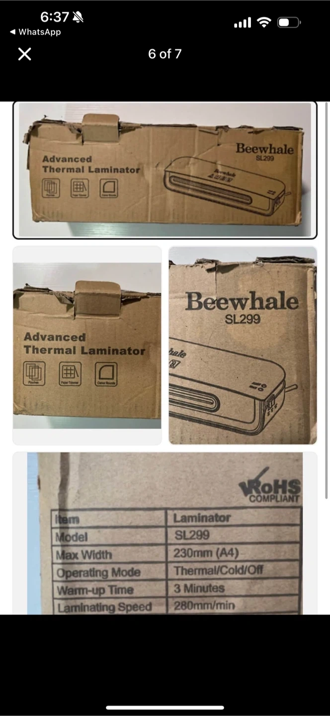 Here's a Beewhale SL299 A4 laminator in great condition! It's an A4 size laminator that can handle pouch thicknesses of 80-125mic and roller widths of 230mm. It's ready to help you with all your laminating needs