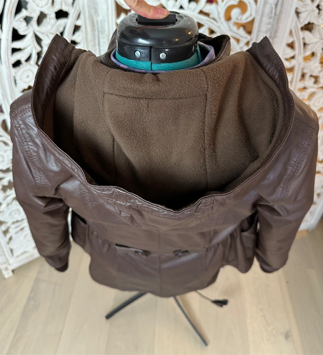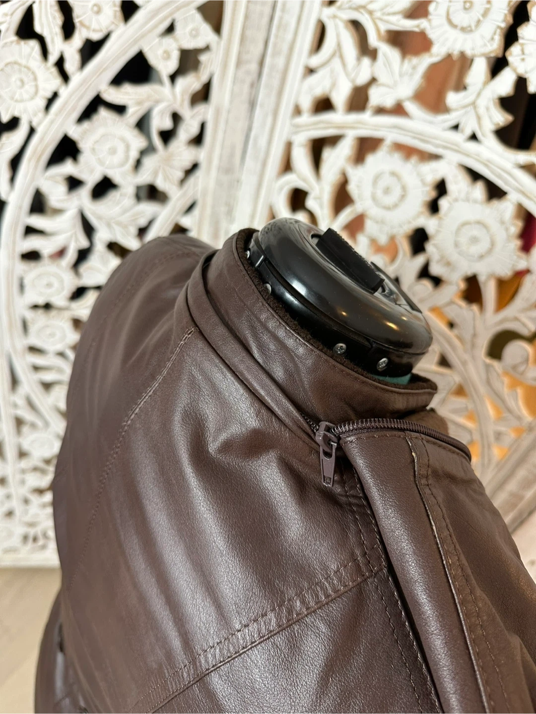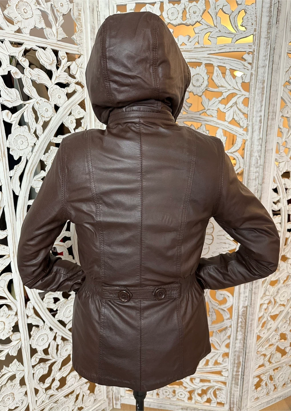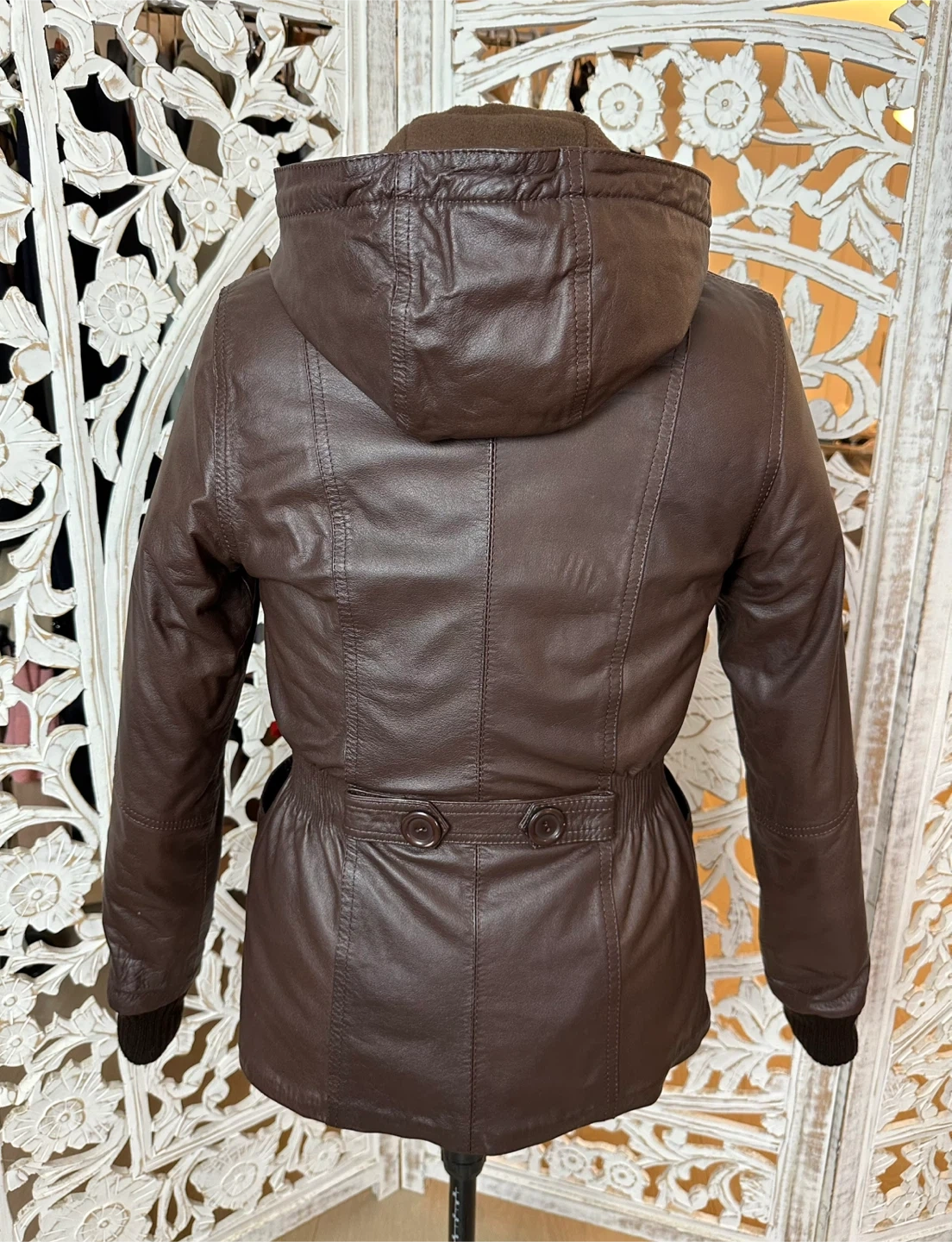 This Fabio jacket is a versatile, must-have piece for any fashion-forward wardrobe. Crafted from 100% genuine brown leather with knit collar and sleeve details, it features a pleated waist, a zipper closure, and a removable hood for added versatility. The fleece lining ensures warmth and comfort, making it perfect for cold fall, spring, and mild winter days.