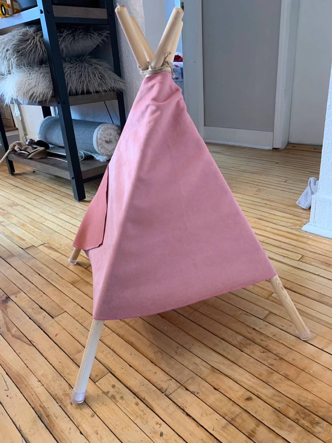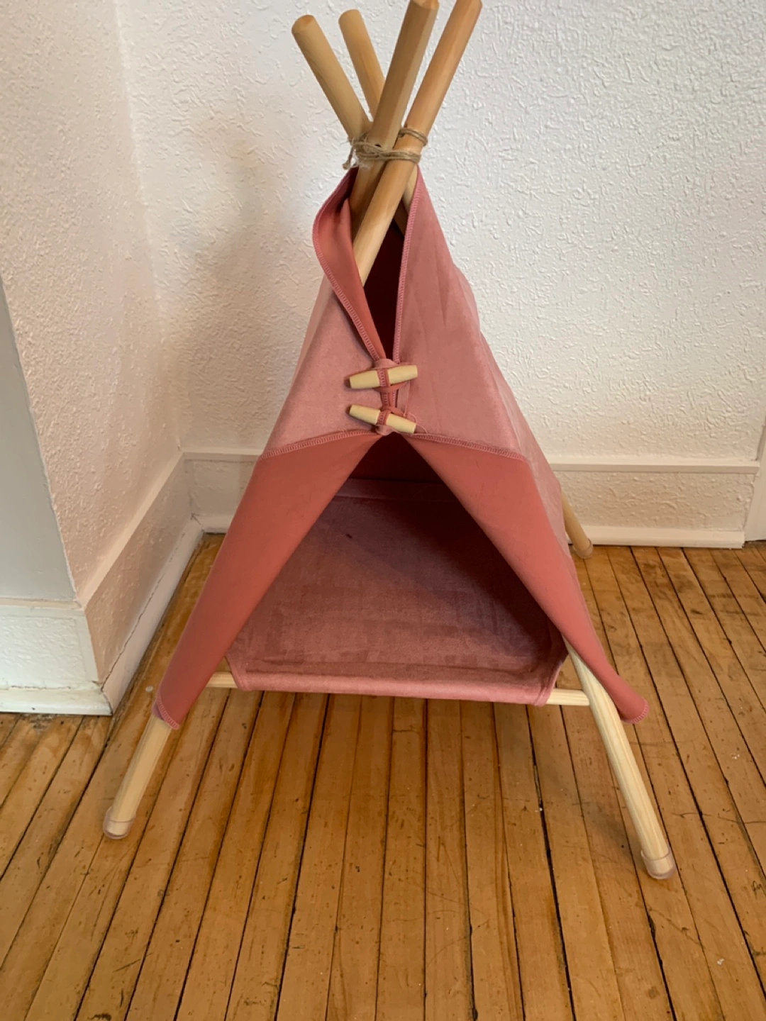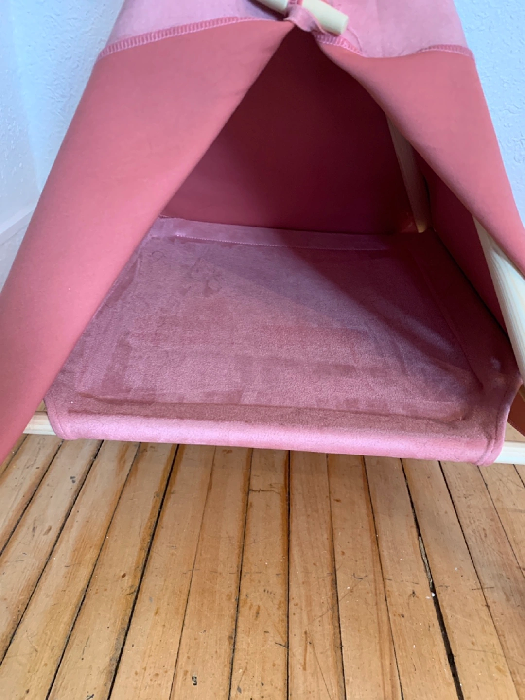 Pink teepee tent with wooden poles and a soft floor. Great for Cat or small pet relaxing area.