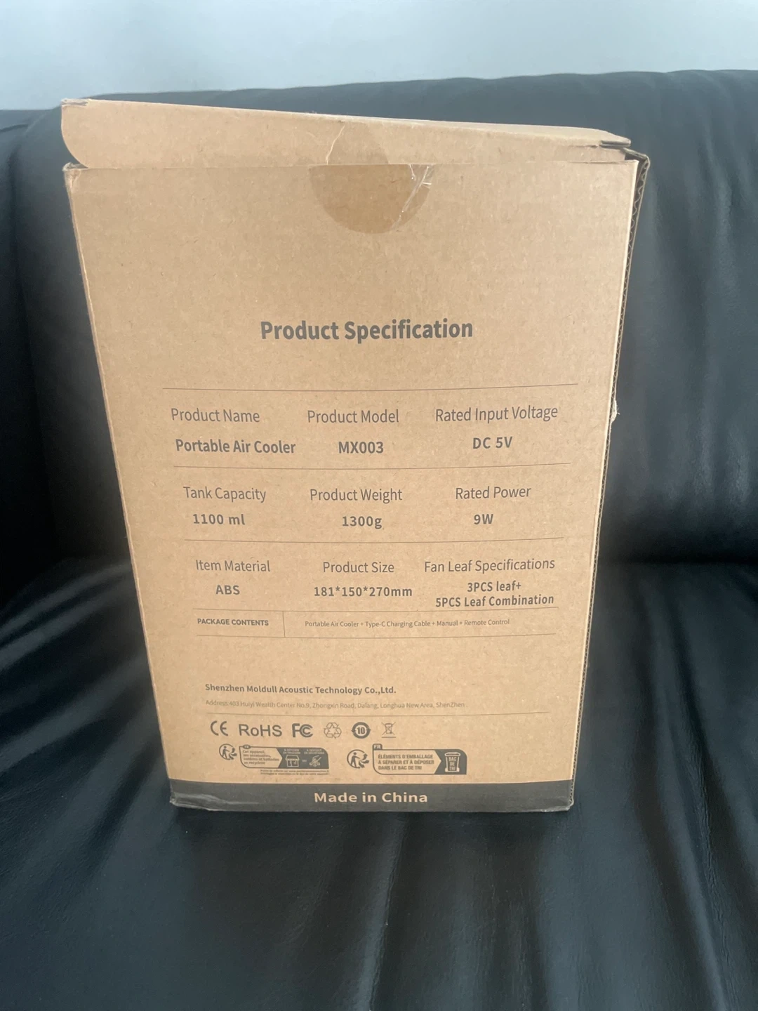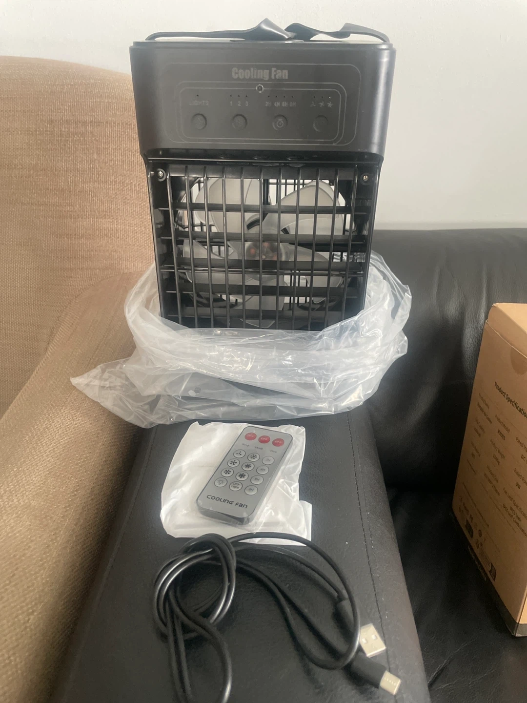 Used only once - This portable air cooler has a 1100 ml tank capacity and a powerful 9W motor. It offers intelligent timing, cool lighting effects, and multi-position cooling. It's made of ABS material and measures 181*150*270mm. It comes with a USB charging cable and a remote control.